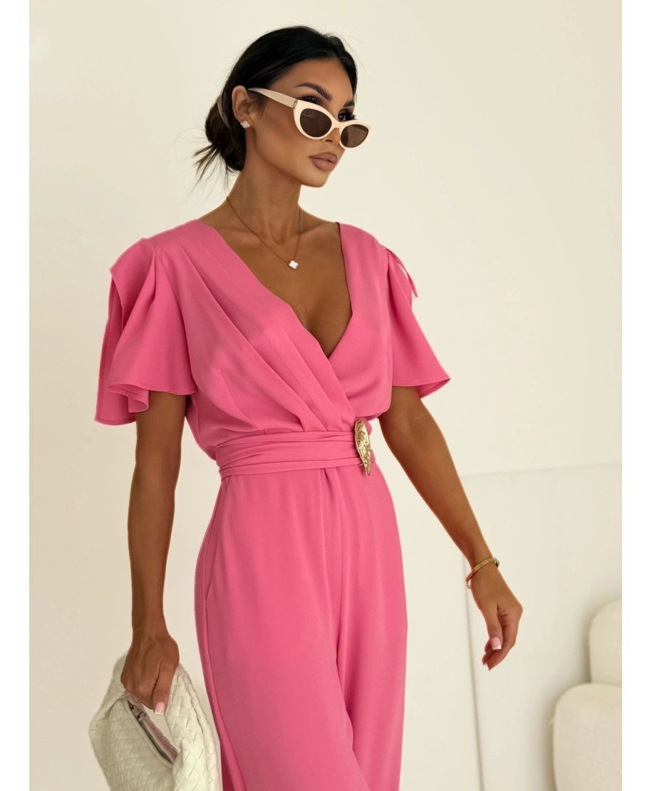 Tuta elegante donna rosa – Jumpsuit cerimonia- Scollo a portafoglio e pantaloni ampi - Tris