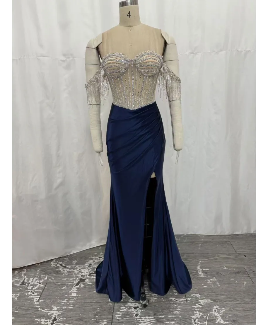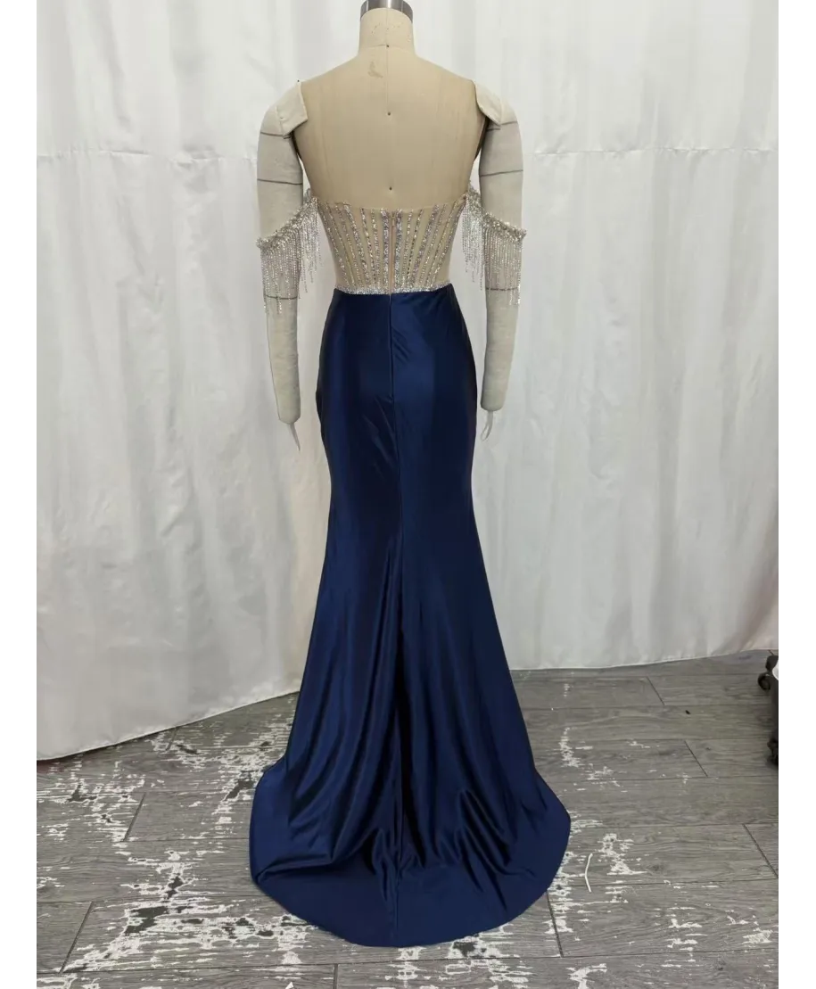 Abito a sirena lungo in raso blu con corpino nude effetto trasparenza ricamato con perline e frange brillanti. Le spalline scese aggiungono sensualità al modello, mentre la gonna aderente con spacco alto e drappeggio laterale valorizza la silhouette in modo elegante e sofisticato.