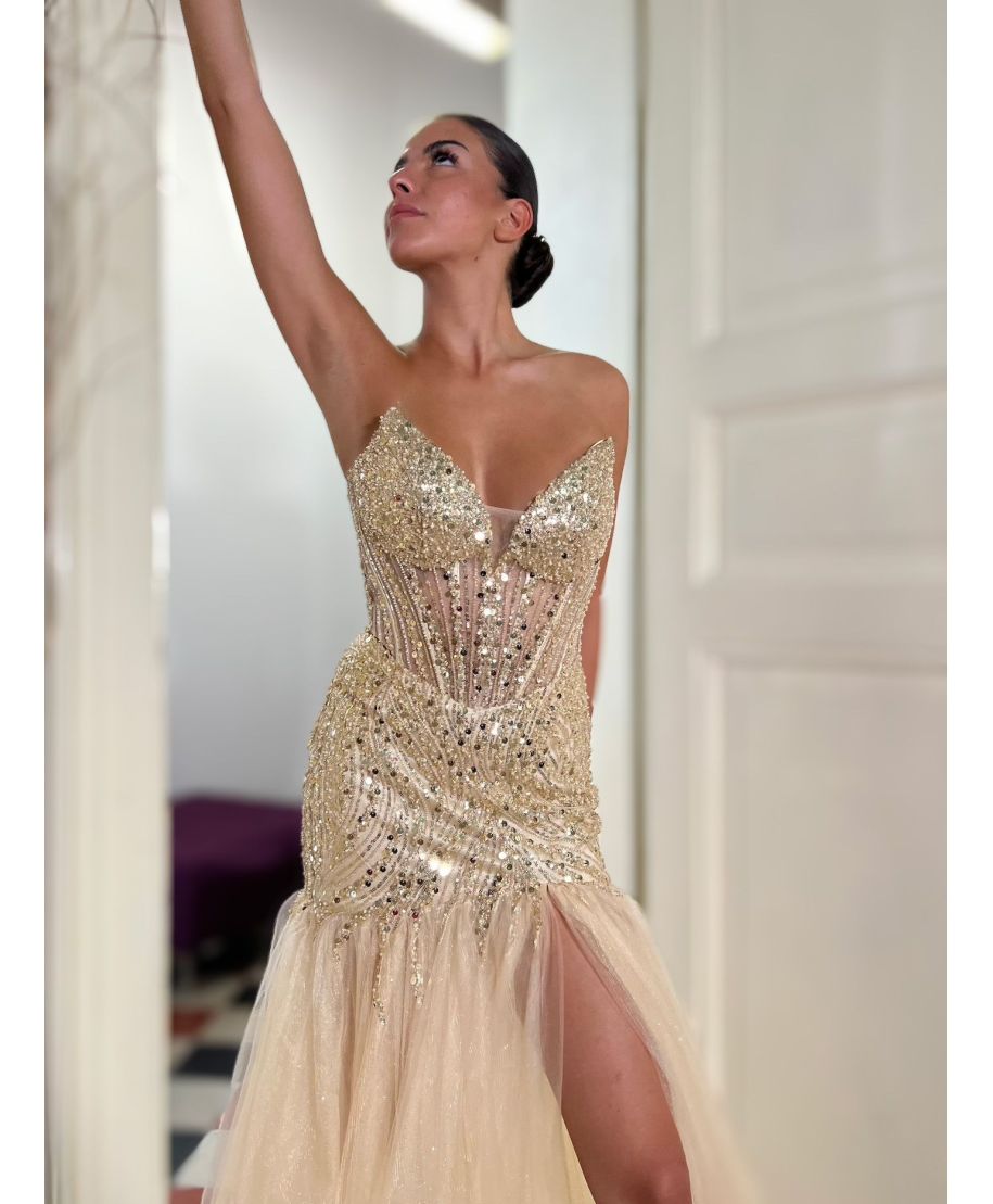 Eleganza e raffinatezza si incontrano in questo abito a sirena, un capo perfetto per occasioni esclusive come cerimonie, feste di gala e diciottesimi compleanni. Il corpetto strutturato è arricchito da un’elegante lavorazione con paillettes e perline luminose, che catturano la luce a ogni movimento. Il tulle morbido della gonna dona un effetto etereo e sofisticato, mentre lo spacco sensuale slancia la silhouette, esaltando le forme con grazia e classe.