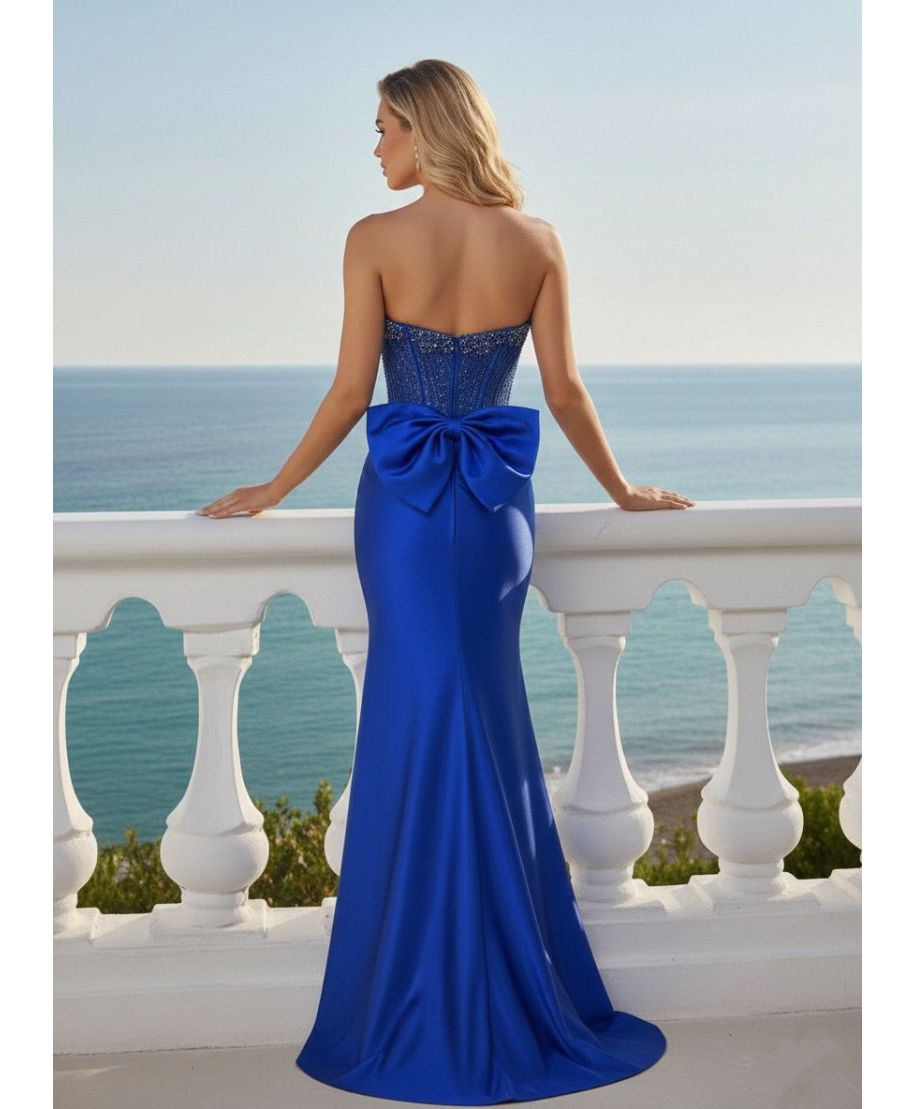 Vestito a sirena con scollatura a cuore finemente decorata con pietre cucite a mano