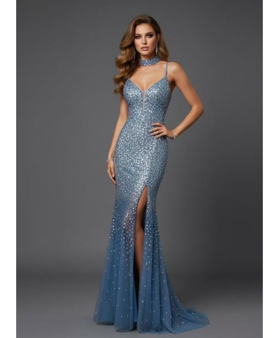 Realizzato con il massimo livello di attenzione ai dettagli, l'abito presenta una silhouette a sirena che scivola armoniosamente sulla figura. La linea affusolata si apre poi con grazia a partire dalle ginocchia, creando un effetto di glamour senza tempo. Il color azzurro aggiunge un tocco di freschezza e modernità, donando all'abito una tonalità celestiale che cattura l'attenzione in ogni stanza. Le applicazioni di cristalli Swarovski lungo il corpetto e le spalle aggiungono una dose extra di lusso e brillantezza, facendo sì che chi lo indossa emani una luce propria ad ogni passo.