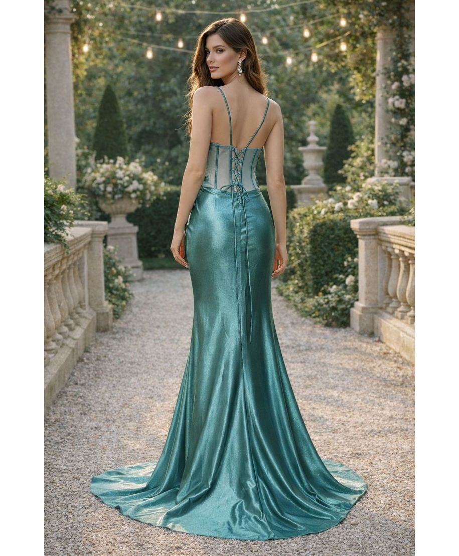 - Modello a sirena con spacco e corpetto regolabile con lacci