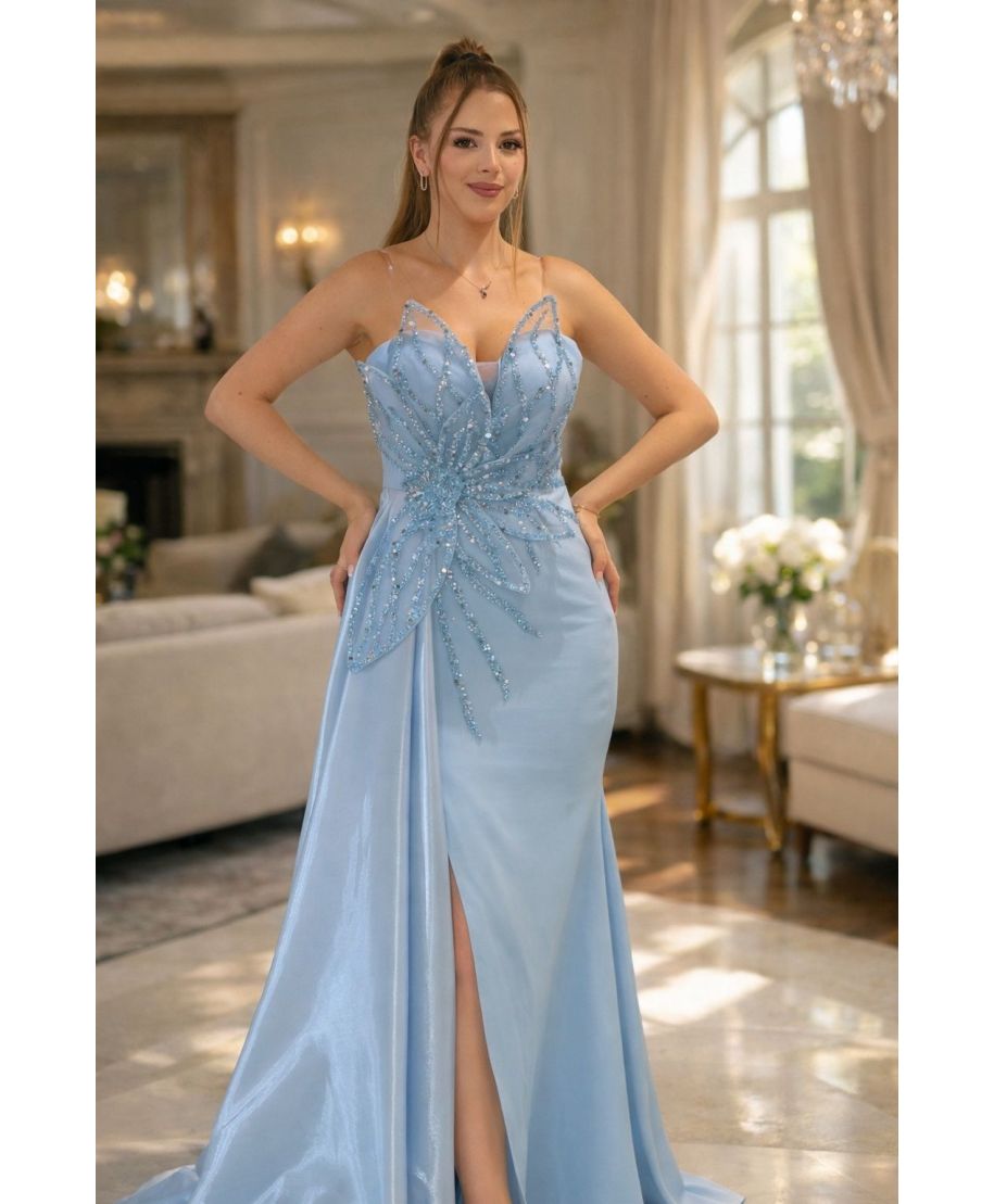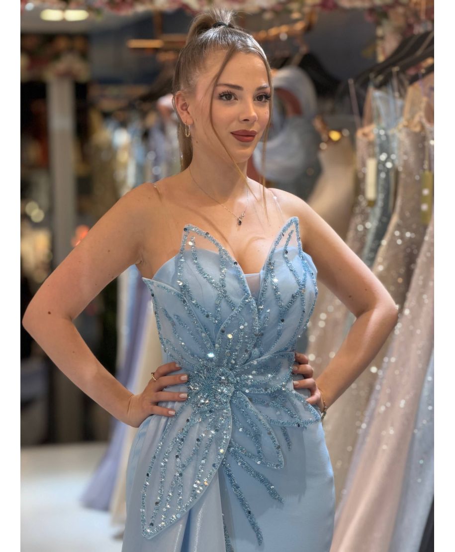 • Elegante abito azzurro con coda laterale: perfetto per brillare durante un evento speciale.