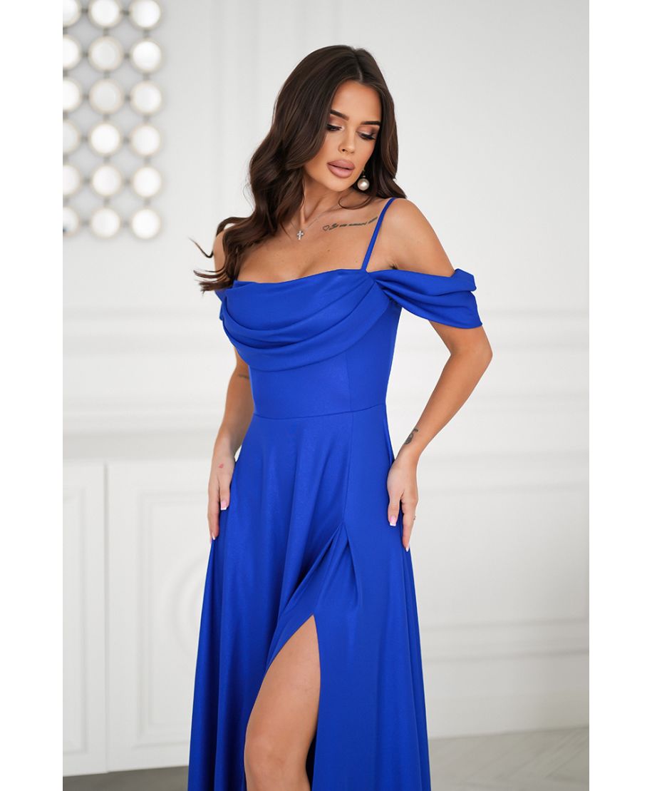 Lasciati conquistare dall'eleganza senza tempo di questo abito da cerimonia blu elettrico, perfetto per occasioni speciali come matrimoni, gala e serate di festa. Il design con spacco laterale e spalle scoperte esalta la silhouette con un tocco di sensualità, mantenendo un'eleganza raffinata.