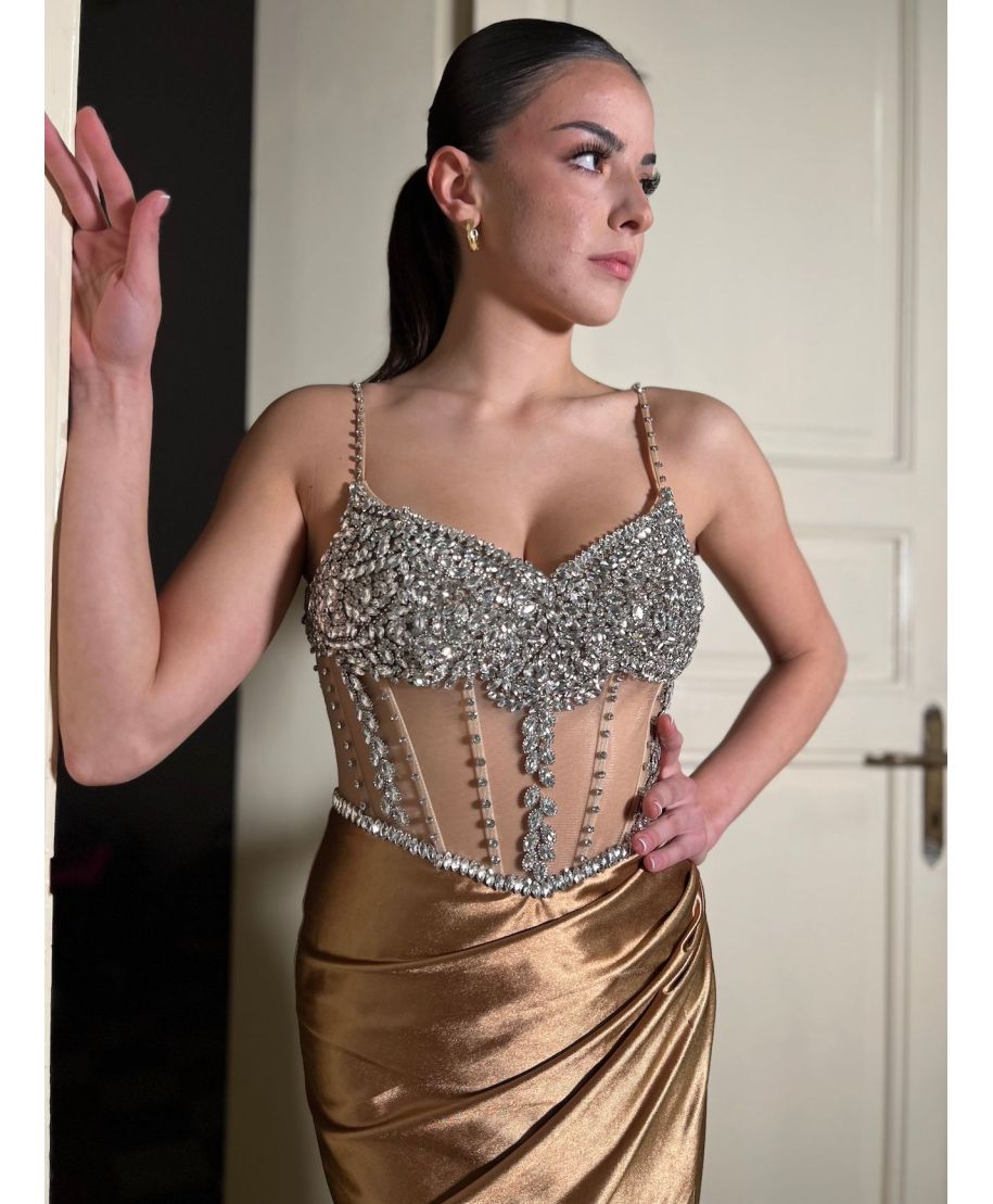 Abito da cerimonia con corpetto gioiello fatto di strass tutti cuciti a mano