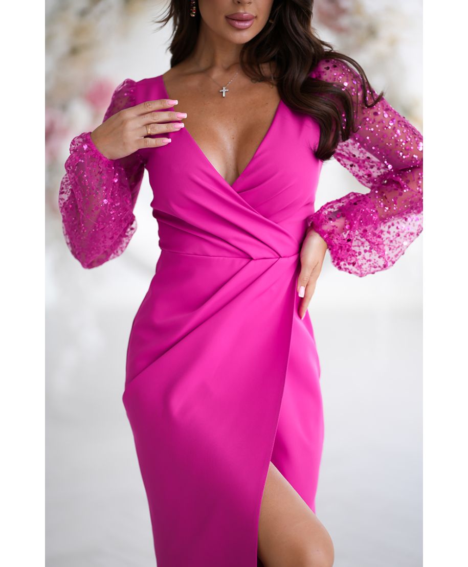 Abito da cerimonia con maniche trasparenti e paillettes - Fucsia