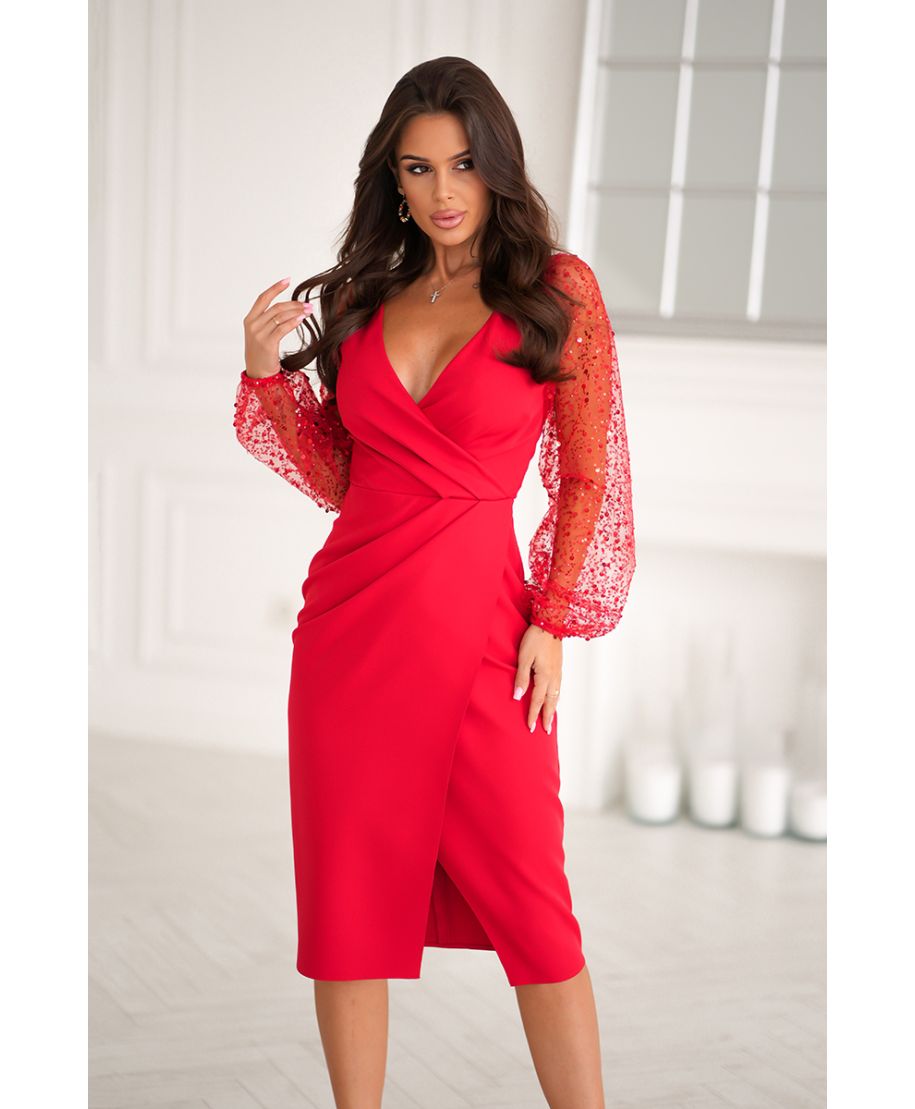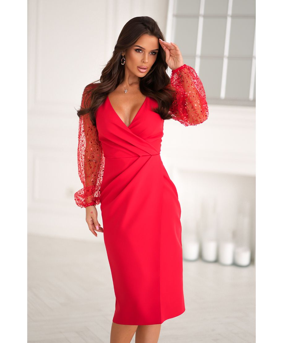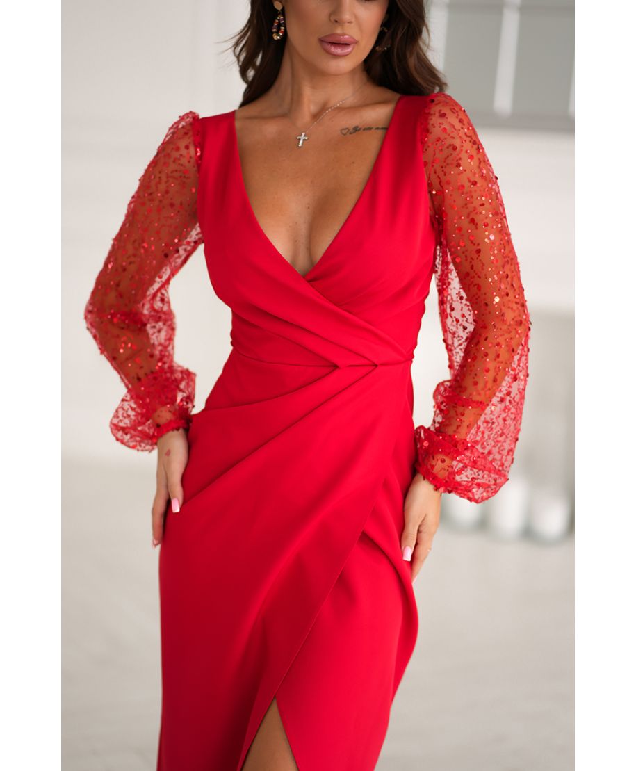 • Abito da cerimonia con maniche trasparenti e paillettes - Colore rosso