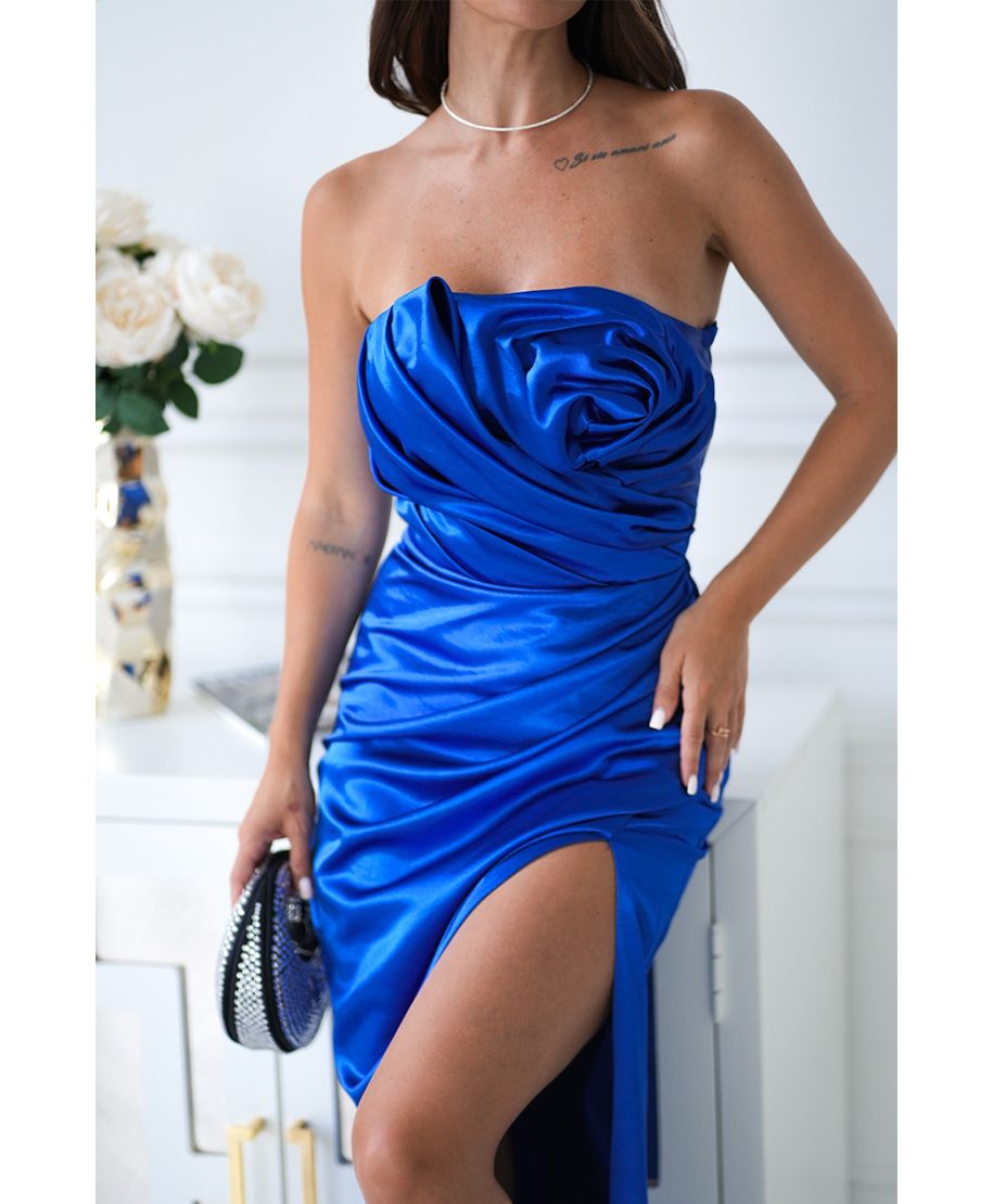 In conclusione, l'abito da cerimonia da donna blu cobalto della collezione Rose rappresenta l'essenza dell'eleganza moderna, concepito per far sentire ogni donna speciale in ogni occasione. Non perdere l'opportunità di brillare con stile in questo straordinario capo d’abbigliamento.Elegancka sukienka z połyskującej satyny, bez ramiączek, ozdobiona dużą, drapowaną różą umieszczoną na biuście. Dopasowany fason podkreśla sylwetkę, a wysokie rozcięcie na nodze dodaje lekkości i kobiecego uroku. Idealna na wyjątkowe okazje i wieczorne wyjścia.Skład:Tkanina:93%Poliester, 7% ElastanKod produktu: 335-05Kolor: chabrowyWymiary modelki: 88-60-90Zamek: kryty z tyłuRozmiar na modelce: 34Model występuję w rozmiarach 34, 36, 38, 40, 42
