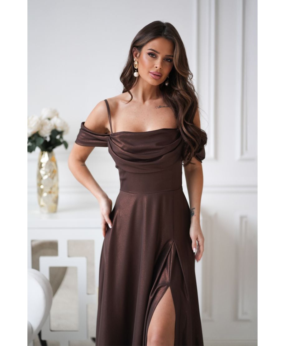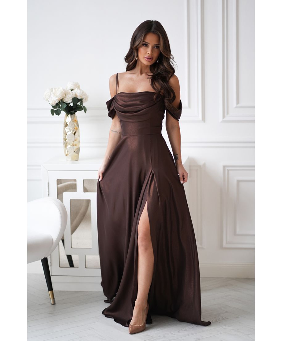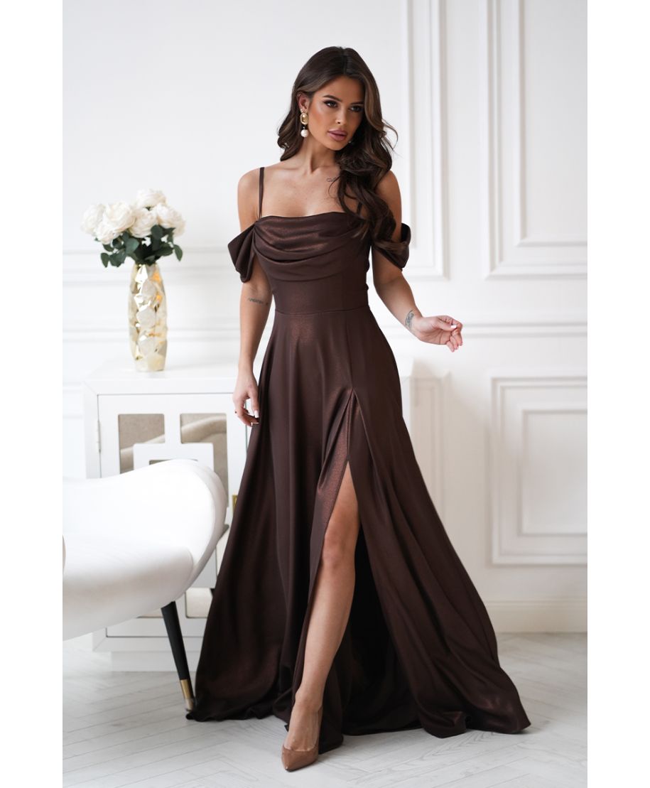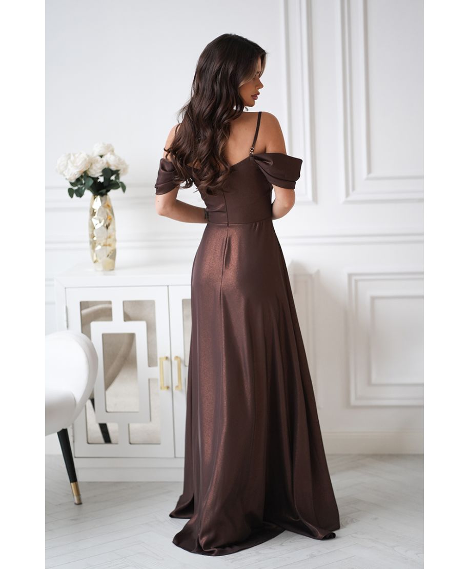 Abito da Cerimonia Marrone Cioccolato con Spalle Scoperte e Gonna Fluida