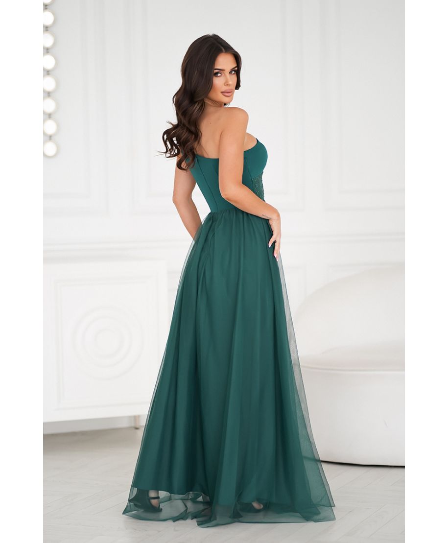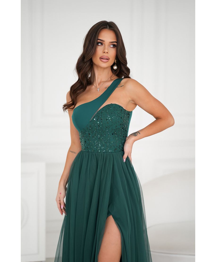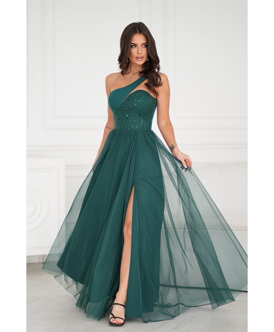 Raffinato ed elegante, questo abito da cerimonia monospalla è perfetto per le occasioni speciali. Il corpetto decorato con strass scintillanti e il tessuto in tulle leggero donano un tocco sofisticato e glamour. Lo spacco frontale valorizza la silhouette, regalando un look femminile e seducente. L’abito è ideale per damigelle, testimoni di nozze o per chi cerca un outfit d’effetto per un gala o una festa esclusiva.