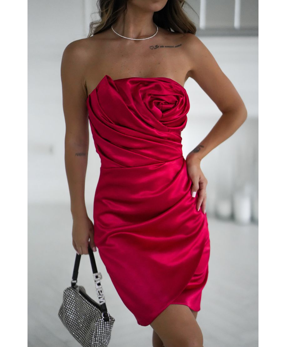 Se cerchi un abito da cerimonia rosso raffinato e luminoso, questo modello in satin è la scelta ideale per distinguerti in ogni occasione speciale. Realizzato in tessuto satinato con effetto brillante, unisce sensualità ed eleganza grazie al design senza spalline e alla spettacolare rosa drappeggiata applicata sul décolleté. La linea fasciante esalta la silhouette, mentre la gonna corta con drappeggio laterale dona movimento e armonia. Perfetto come vestito corto elegante rosso per matrimoni, eventi serali o cocktail party esclusivi.