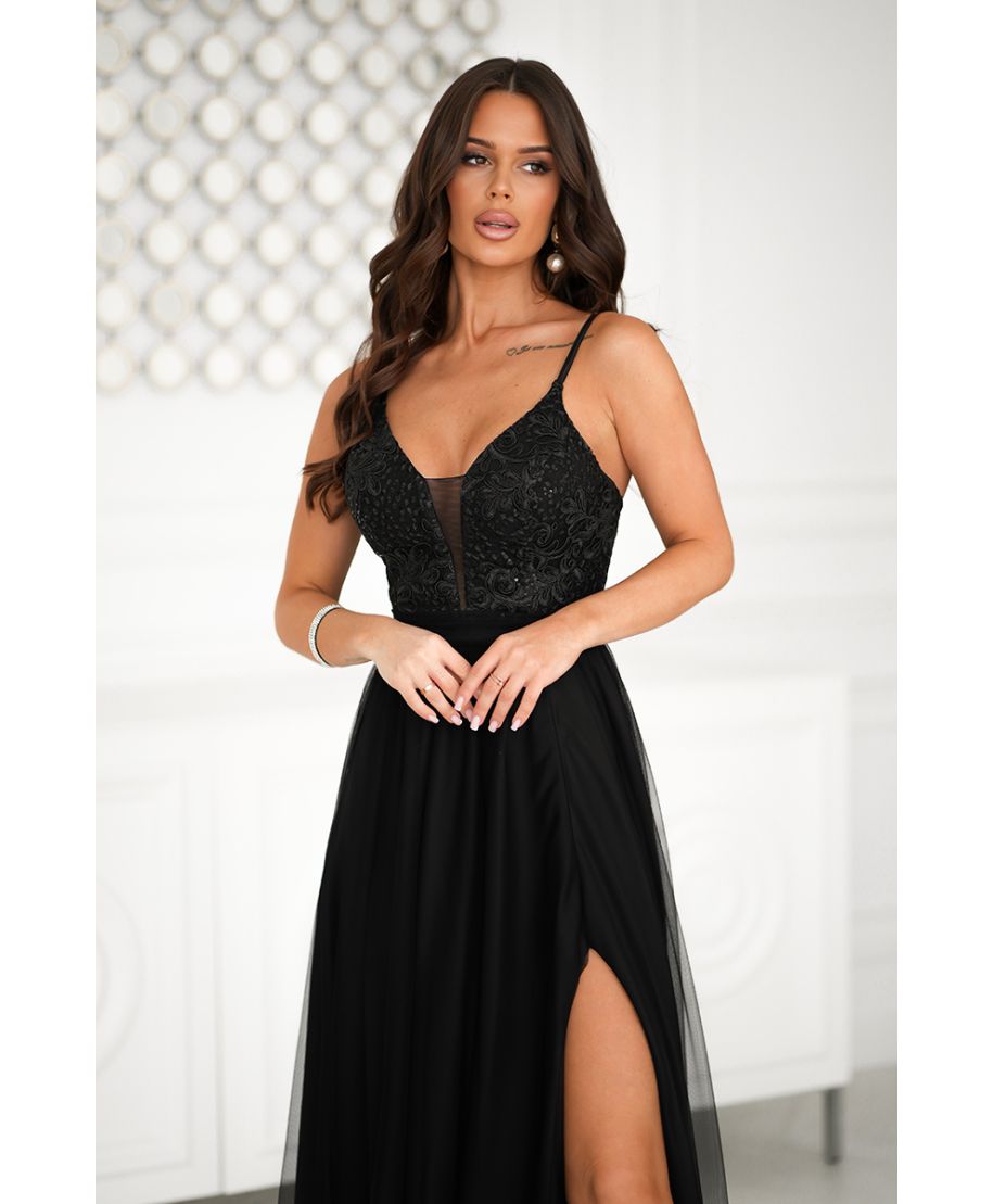 Abito lungo da cerimonia bordeaux con spacco e fiore 3D – Modello Rubi
