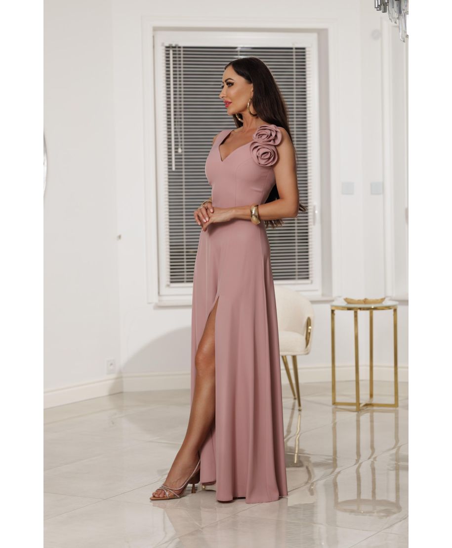 Abito da sera lungo - Rosa antico – Vestito elegante con fiore 3D e spacco laterale - Anabel