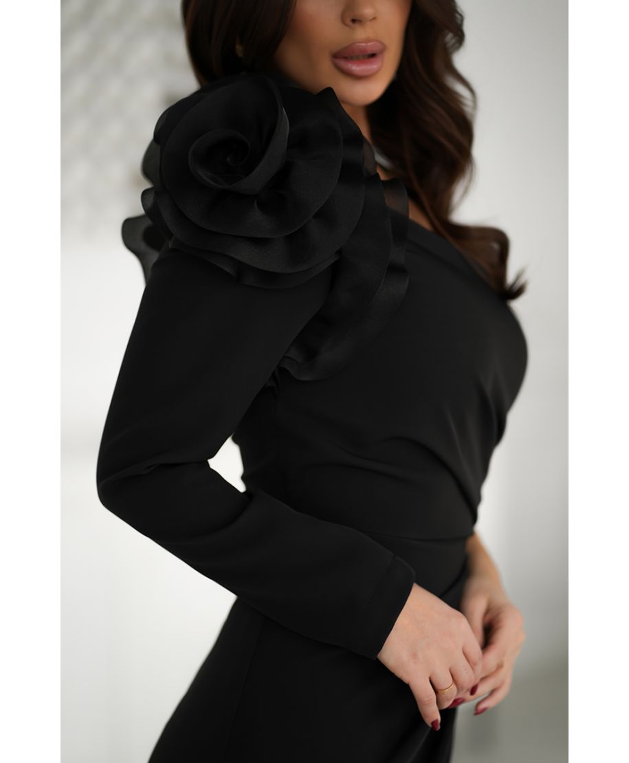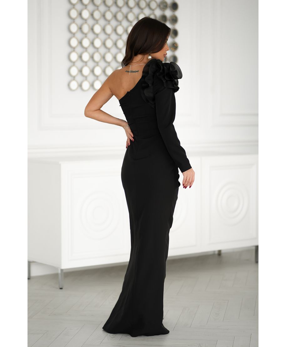 Abito lungo con rosa sulla spalla – Eleganza asimmetrica con spacco e linea aderente