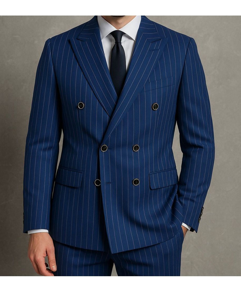 Scopri l'eleganza senza tempo con il nostro abito doppiopetto blu a righe, un capo iconico per l'uomo che desidera distinguersi in ogni occasione. Realizzato con tessuti di alta qualità disegnato in Italia questo abito a vestibilità slim esalta la silhouette maschile con un taglio sartoriale che garantisce comfort e raffinatezza. Il design a righe sottili dona un tocco di classe, perfetto per eventi formali, cerimonie o meeting di lavoro. Abbinato a una camicia bianca e una cravatta scura, questo completo rappresenta la scelta ideale per un look sofisticato e di tendenza