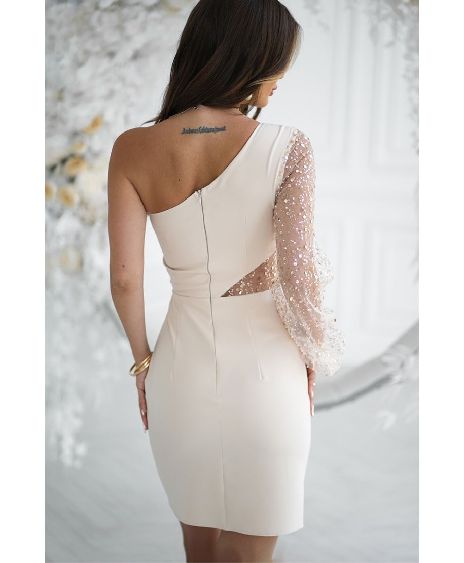 Abito elegante corto- Beige con paillettes e manica mono spalla – Modello tubino asimmetrico