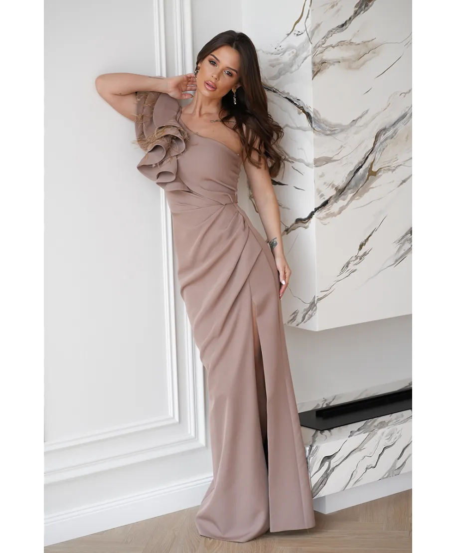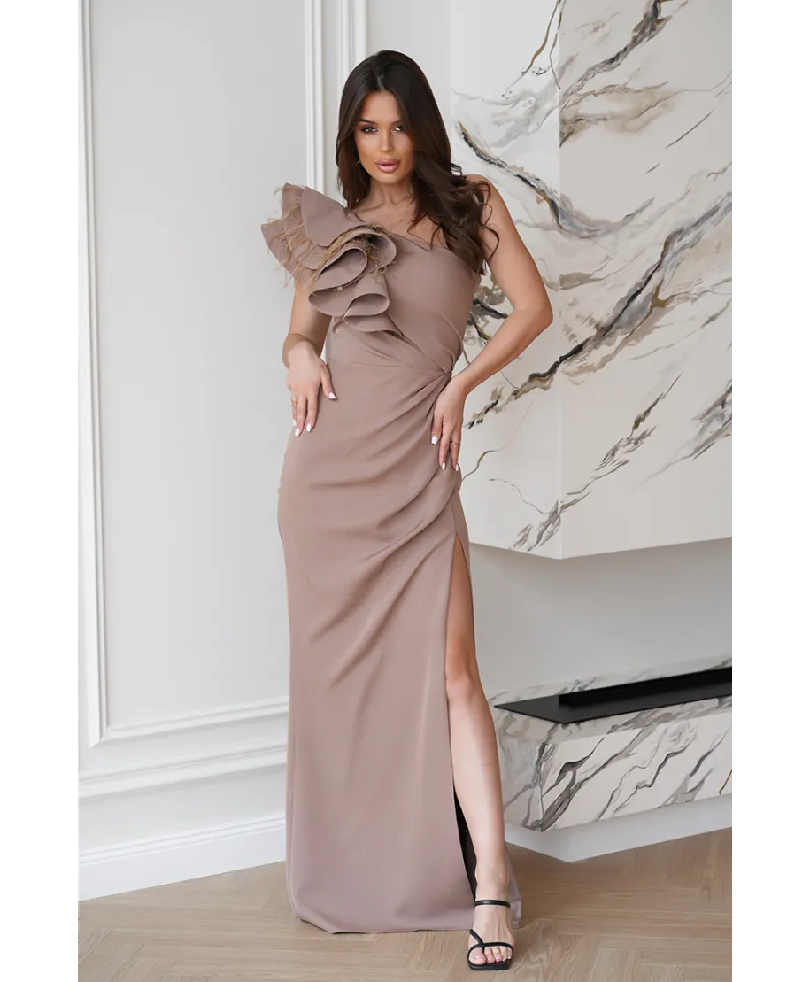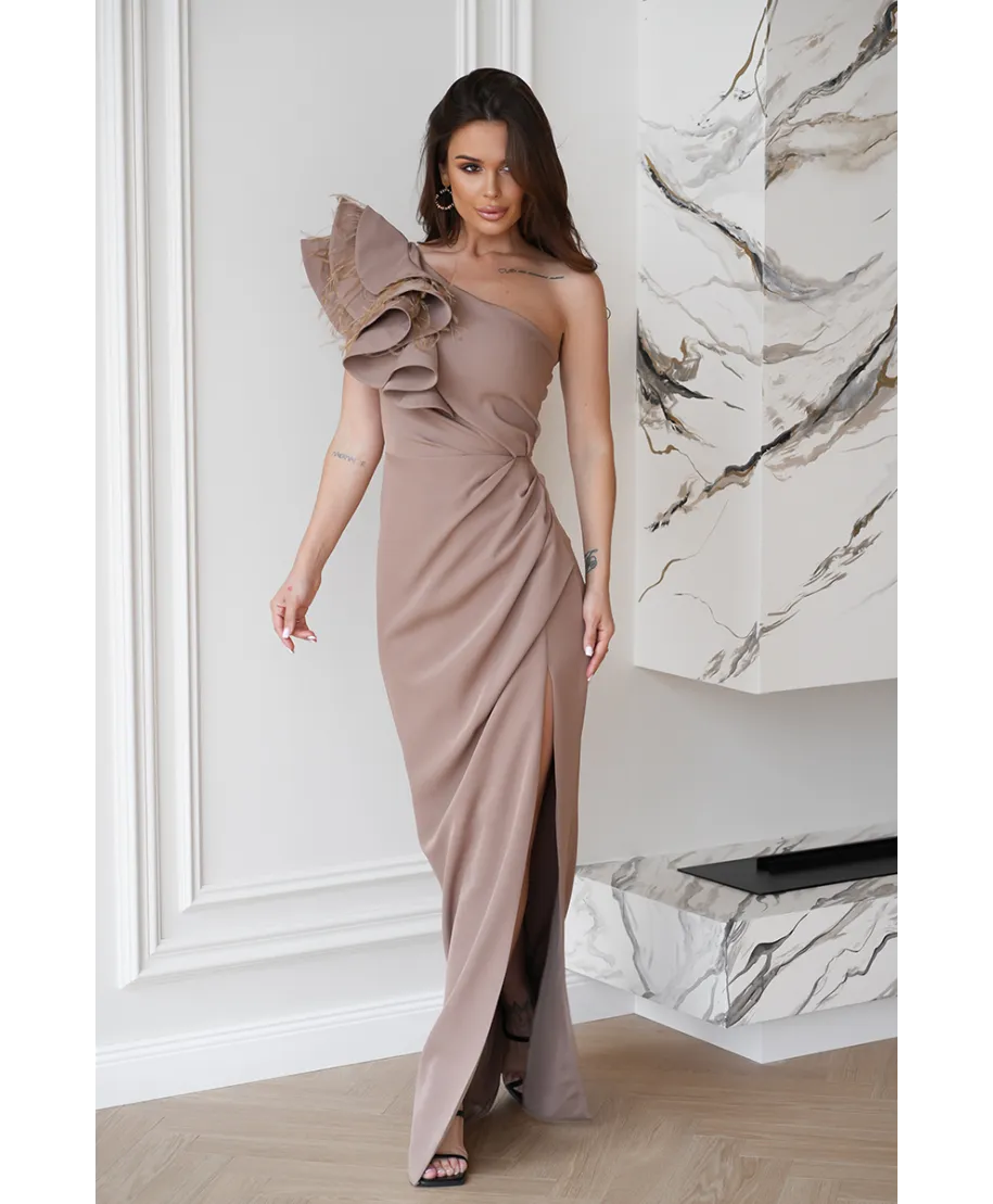 Abito elegante, lungo – Mono spalla - Colore cammello - Fiora