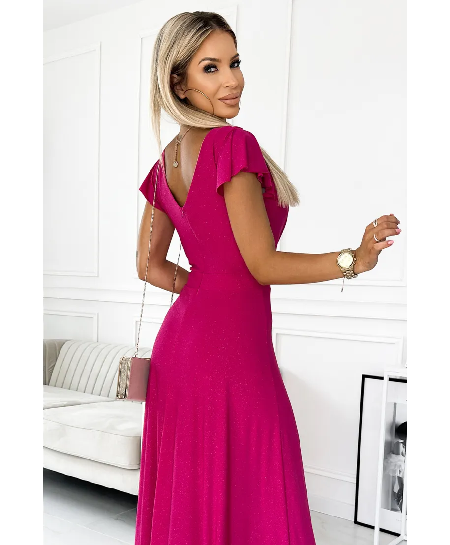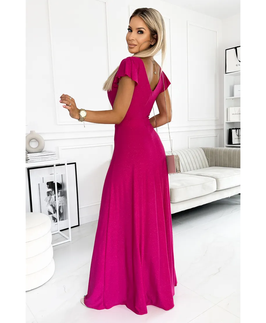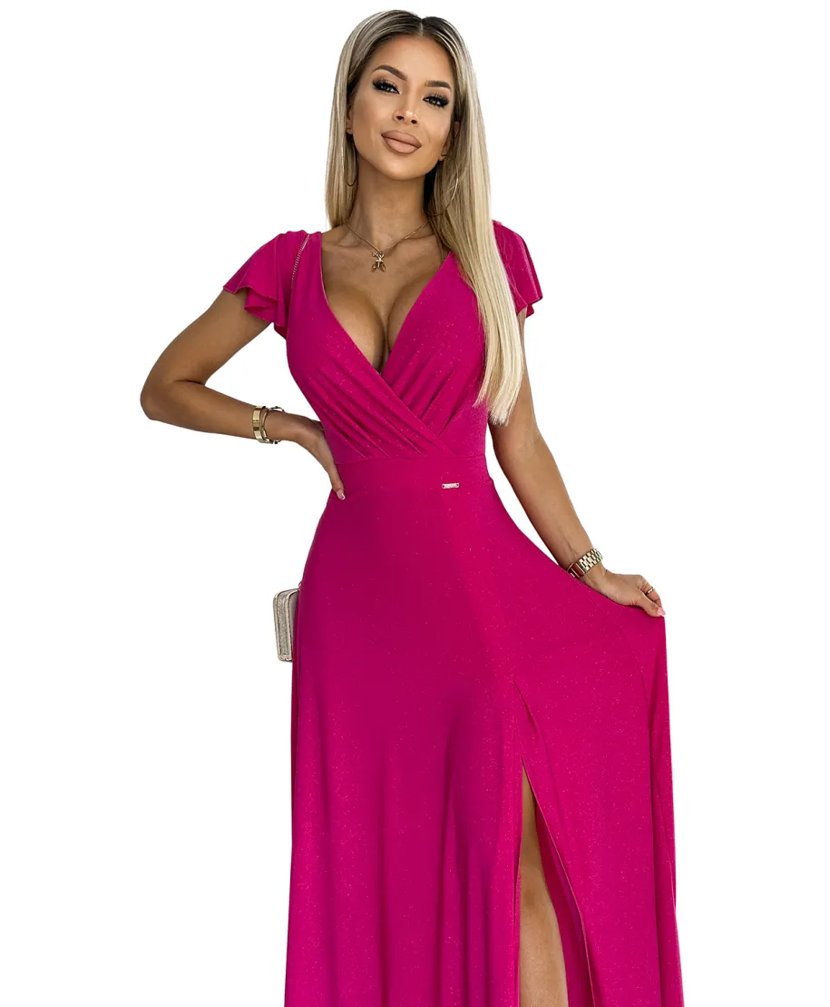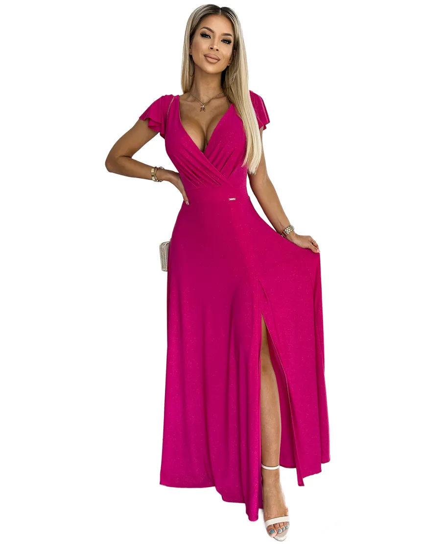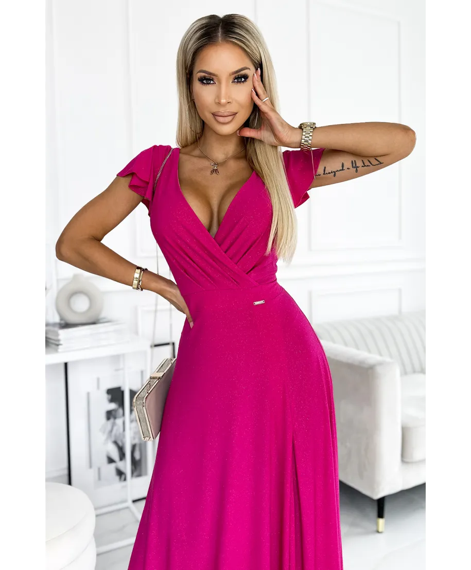 Abito lungo cerimonia fucsia brillante - Scollatura incrociata e spacco elegante - CRYSTAL