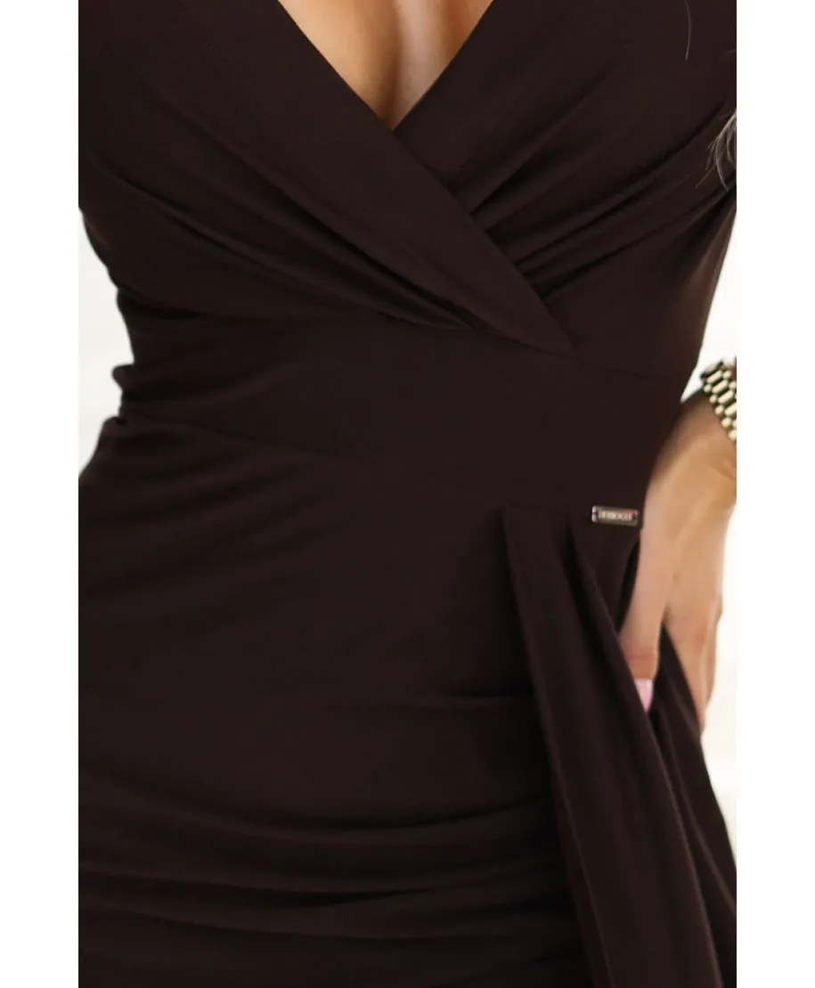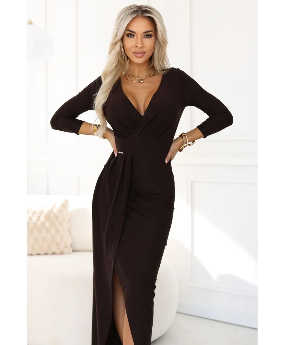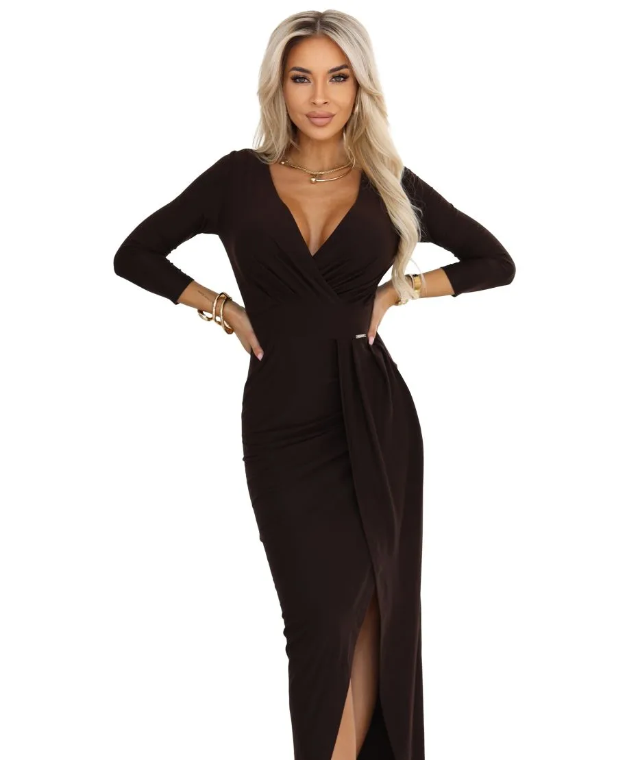 Abito lungo con scollo a portafoglio e spacco – marrone cioccolato