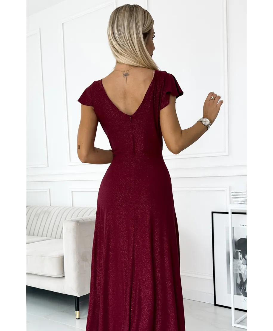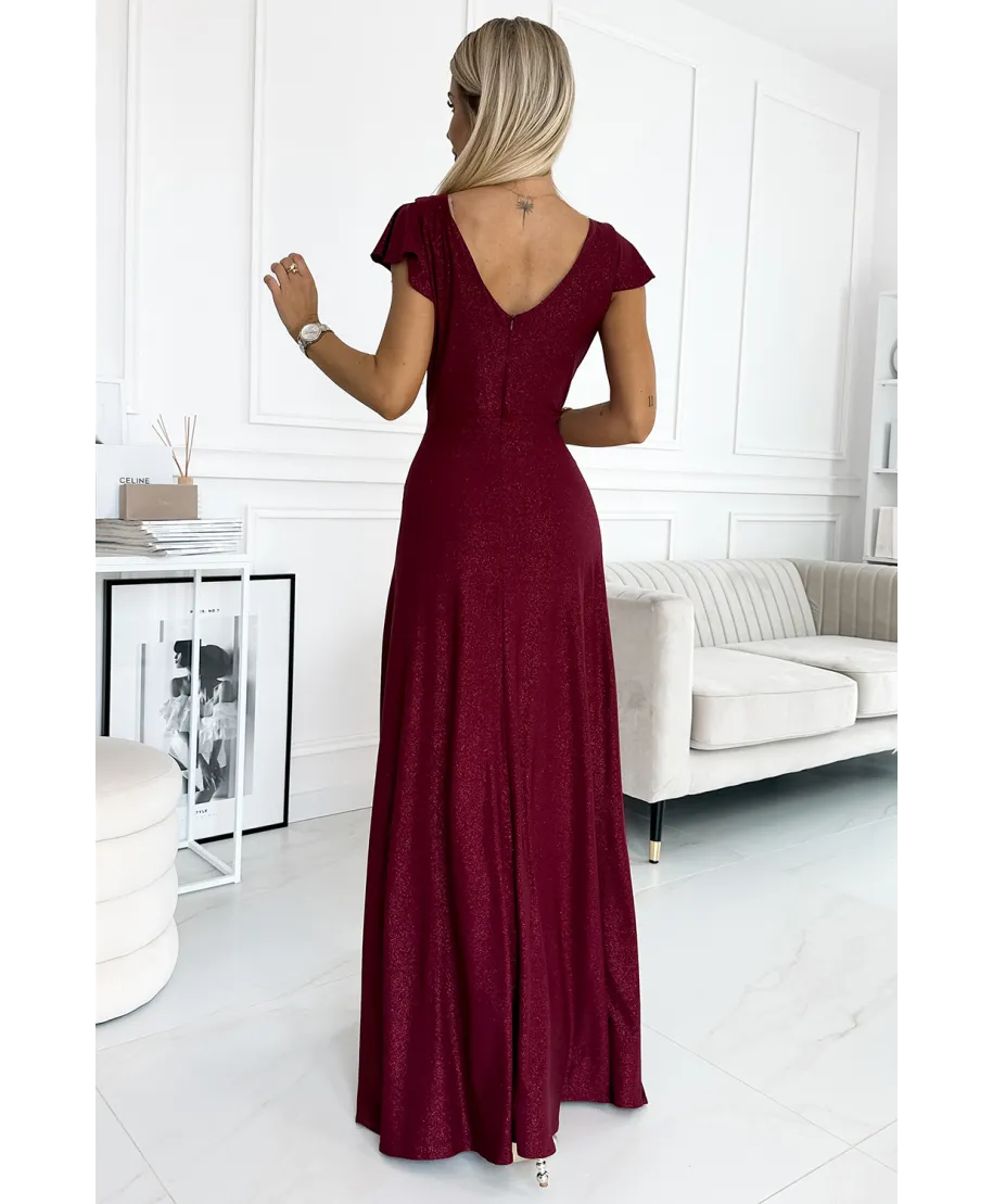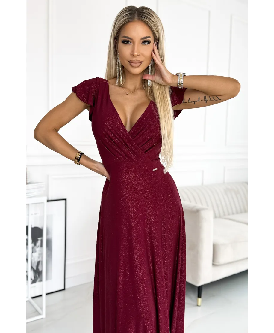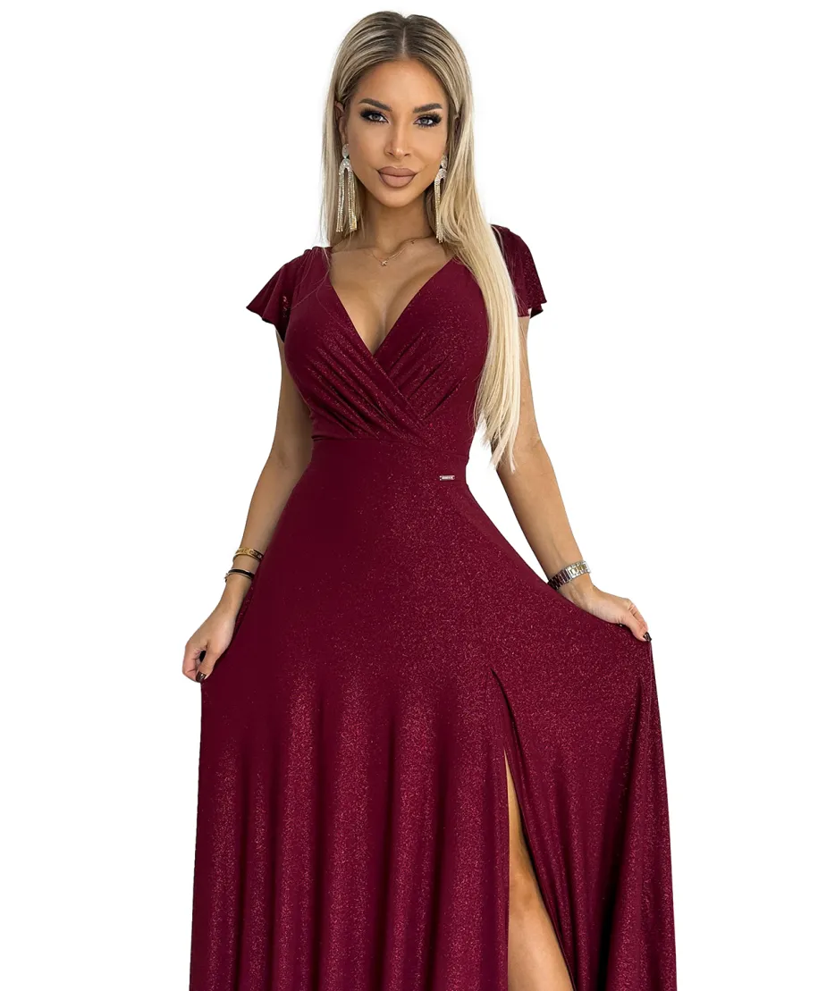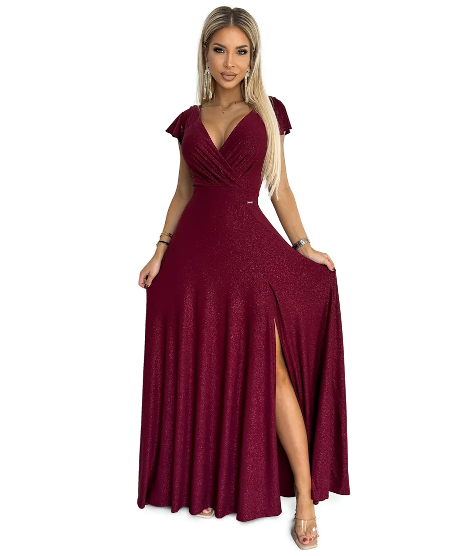 Il corpetto drappeggiato con scollatura incrociata avvolge il décolleté con armonia, creando un effetto visivo slanciato e sofisticato. Le mezze maniche leggere e bilanciate aggiungono stabilità alla linea superiore dell’abito, offrendo comfort e copertura senza appesantire la silhouette. Il punto vita strutturato definisce le forme e scolpisce il profilo, mentre la gonna ampia con caduta regolare Crystal accompagna ogni passo con fluidità naturale. Lo spacco anteriore calibrato dona sensualità misurata, lasciando intravedere la gamba in modo elegante e mai eccessivo.