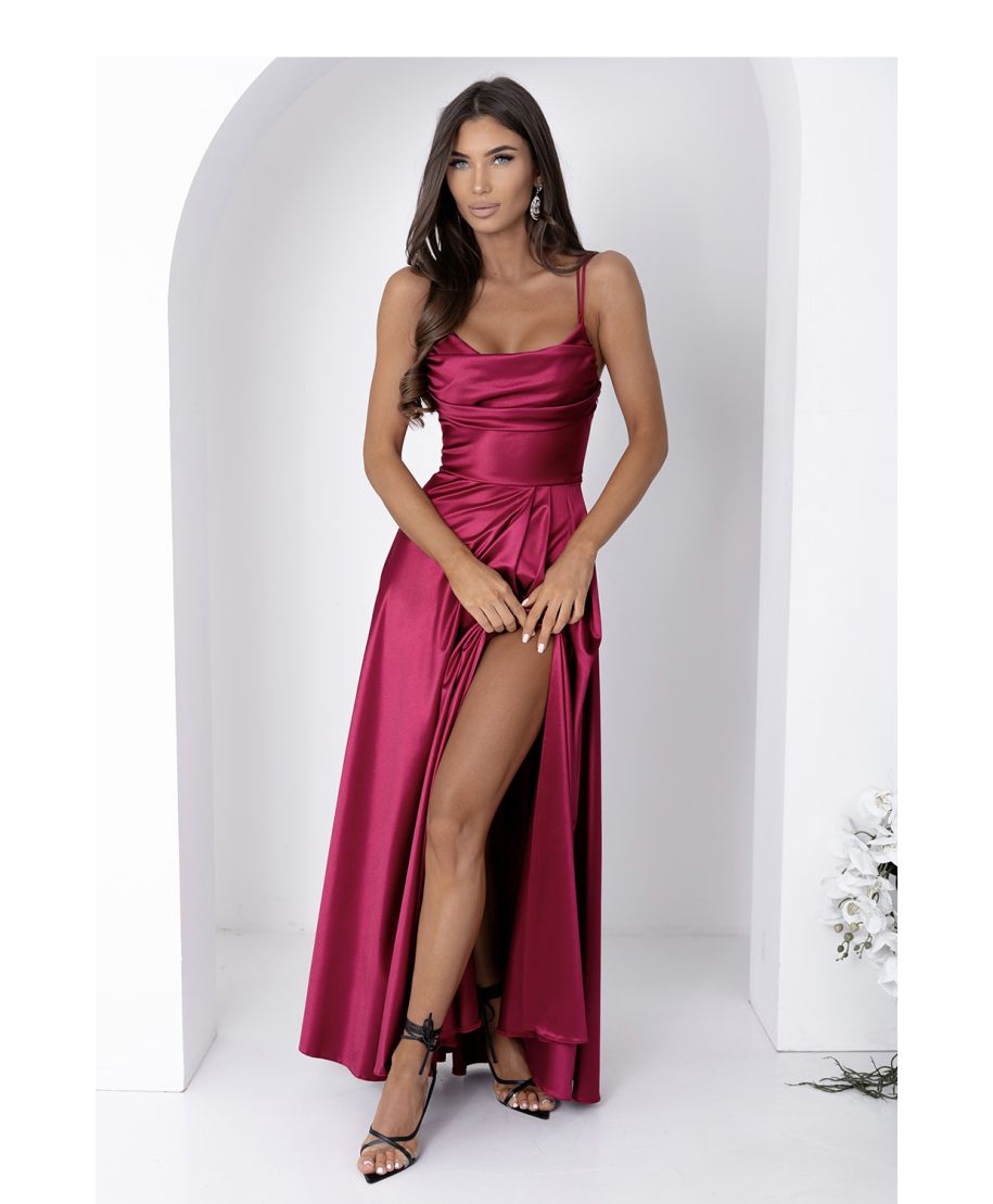 Il lungo abito con sottili spalline incanta con la sua forma elegante e femminile e i dettagli curati. La scollatura fluida si adatta dolcemente al seno, conferendo alla stilizzazione leggerezza e una sottile sensualità. Lo spacco suggestivo sulla gamba accentua la silhouette e aggiunge un carattere deciso all'intero look. Il retro dell'abito è decorato con un laccio ornamentale che consente un perfetto adattamento alla figura e rappresenta un accento unico. Il modello si chiude con una zip coperta posizionata sul lato sinistro, garantendo comodità nell'indossarlo e un'ottima finitura estetica. L'abito si presta perfettamente per uscite serali, feste ed occasioni speciali.