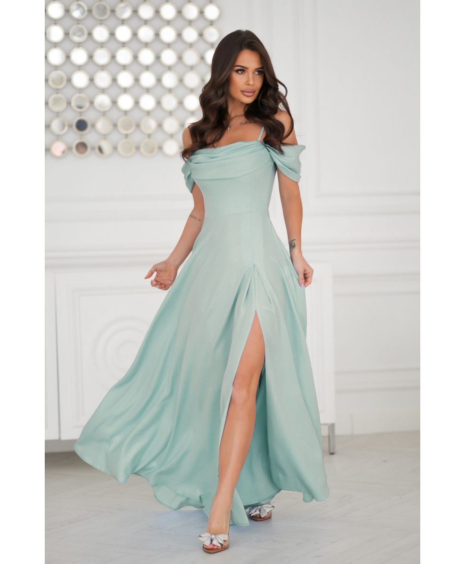 L'abito da cerimonia colore salvia è la scelta perfetta per chi desidera un look romantico e raffinato per le occasioni speciali. Il design femminile si distingue per il corpetto aderente con scollo Bardot, che esalta le spalle con grazia ed eleganza, mentre la gonna fluida con spacco laterale aggiunge un tocco di sensualità e leggerezza. Realizzato in un tessuto morbido e lucente che riflette delicatamente la luce ad ogni passo. Perfetto per le occasioni speciali – unisce eleganza e comfort.