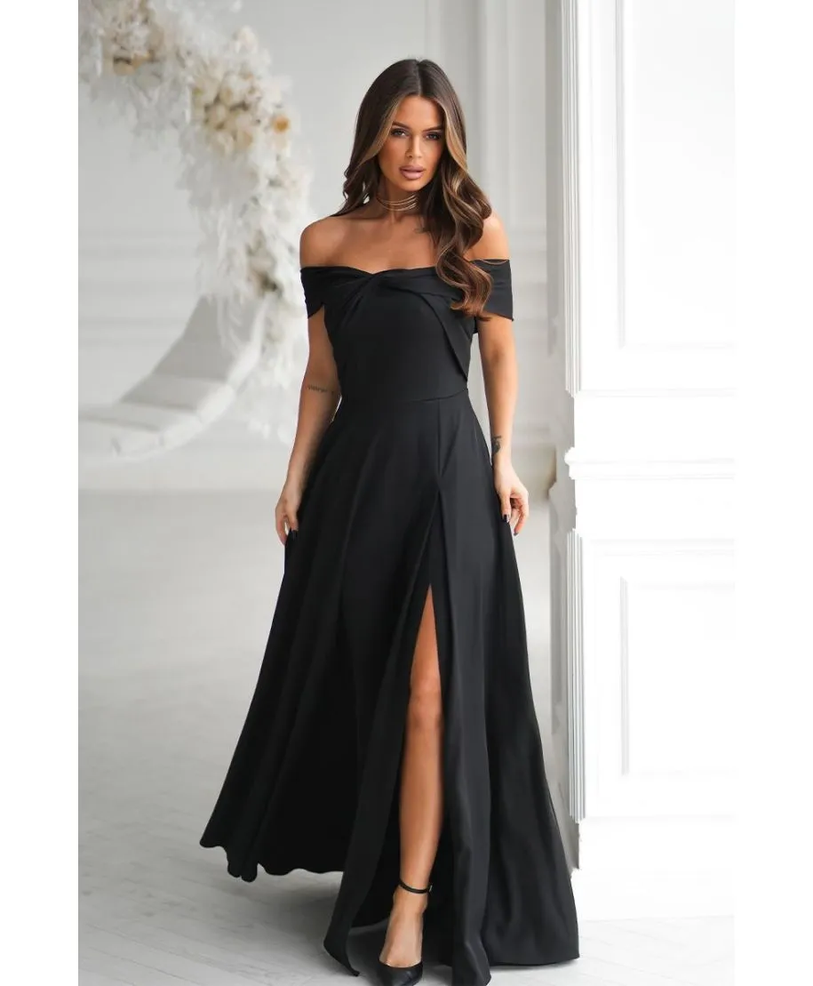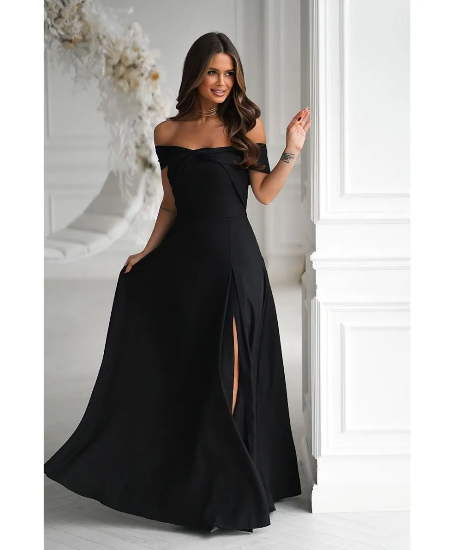 Questo abito nero lungo con spacco è una celebrazione della femminilità: raffinato, sensuale e pieno di carattere. La sua linea fluida e il tessuto brillante ne fanno un capo intramontabile, capace di rendere ogni occasione speciale.