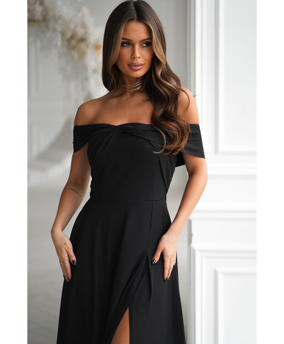 Questo abito nero lungo con spacco è una celebrazione della femminilità: raffinato, sensuale e pieno di carattere. La sua linea fluida e il tessuto brillante ne fanno un capo intramontabile, capace di rendere ogni occasione speciale.