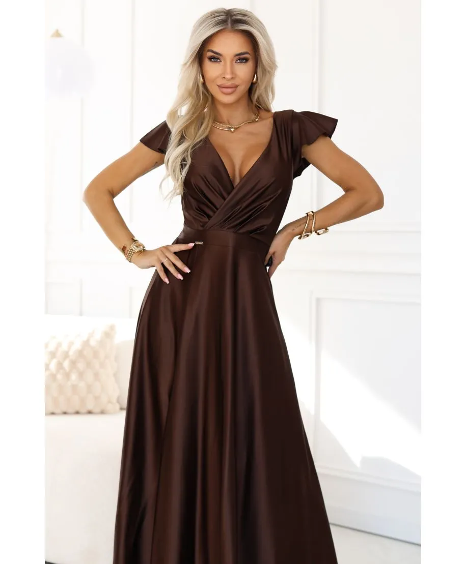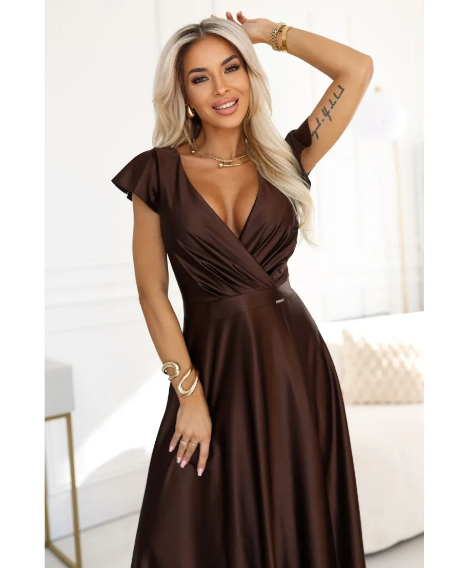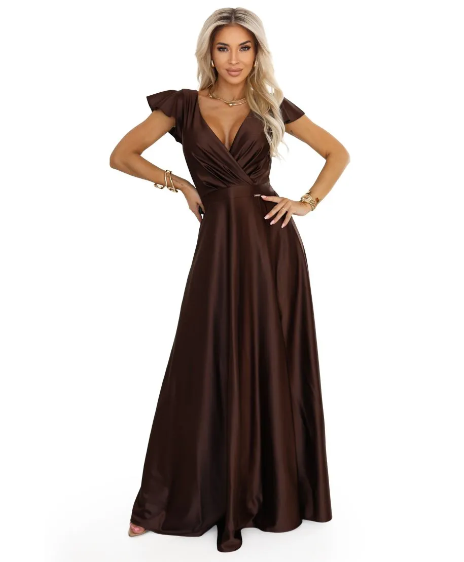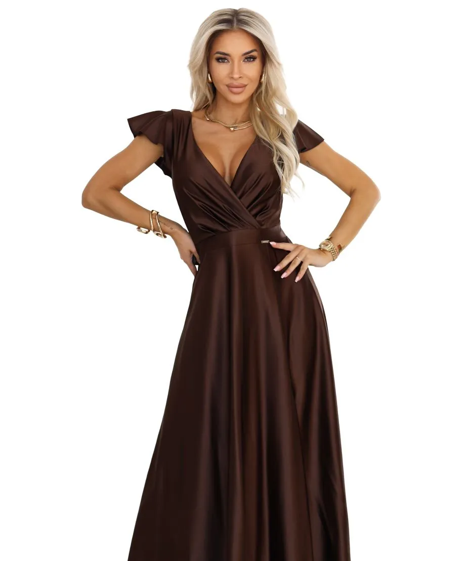 Abito lungo in raso con scollo a portafoglio e maniche ad aletta – marrone cioccolato