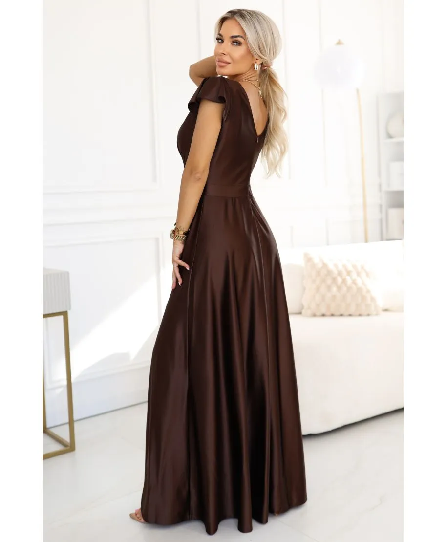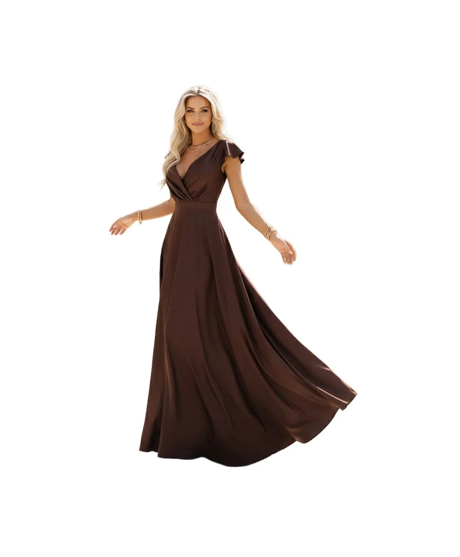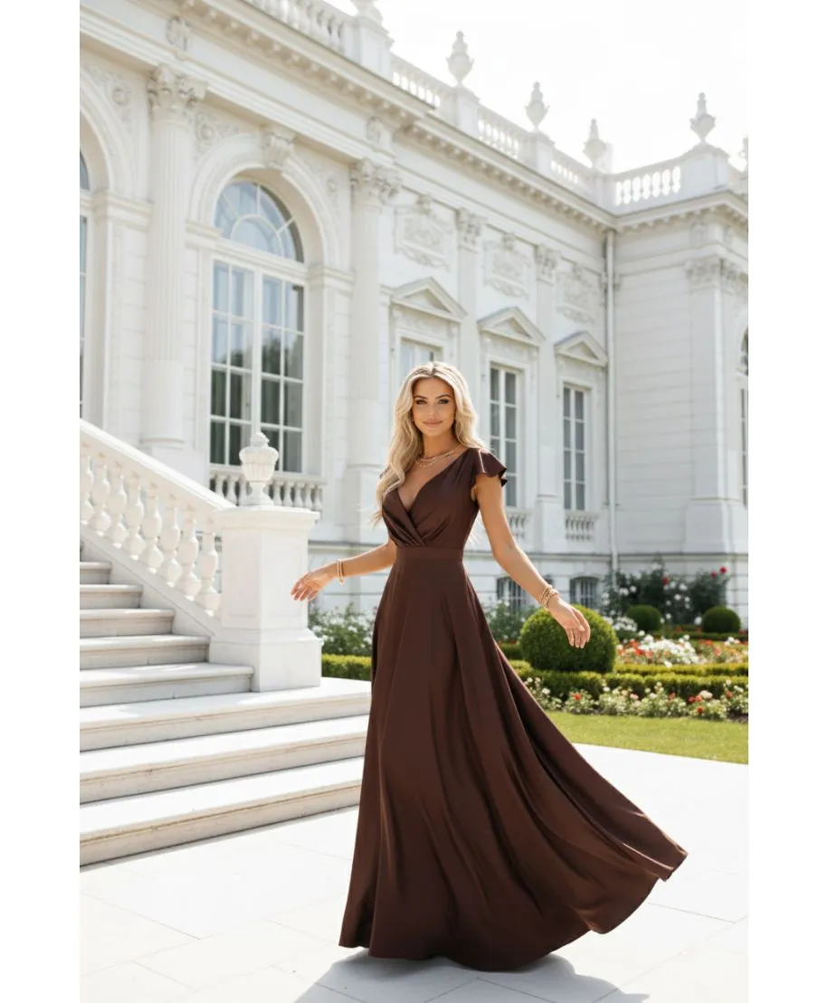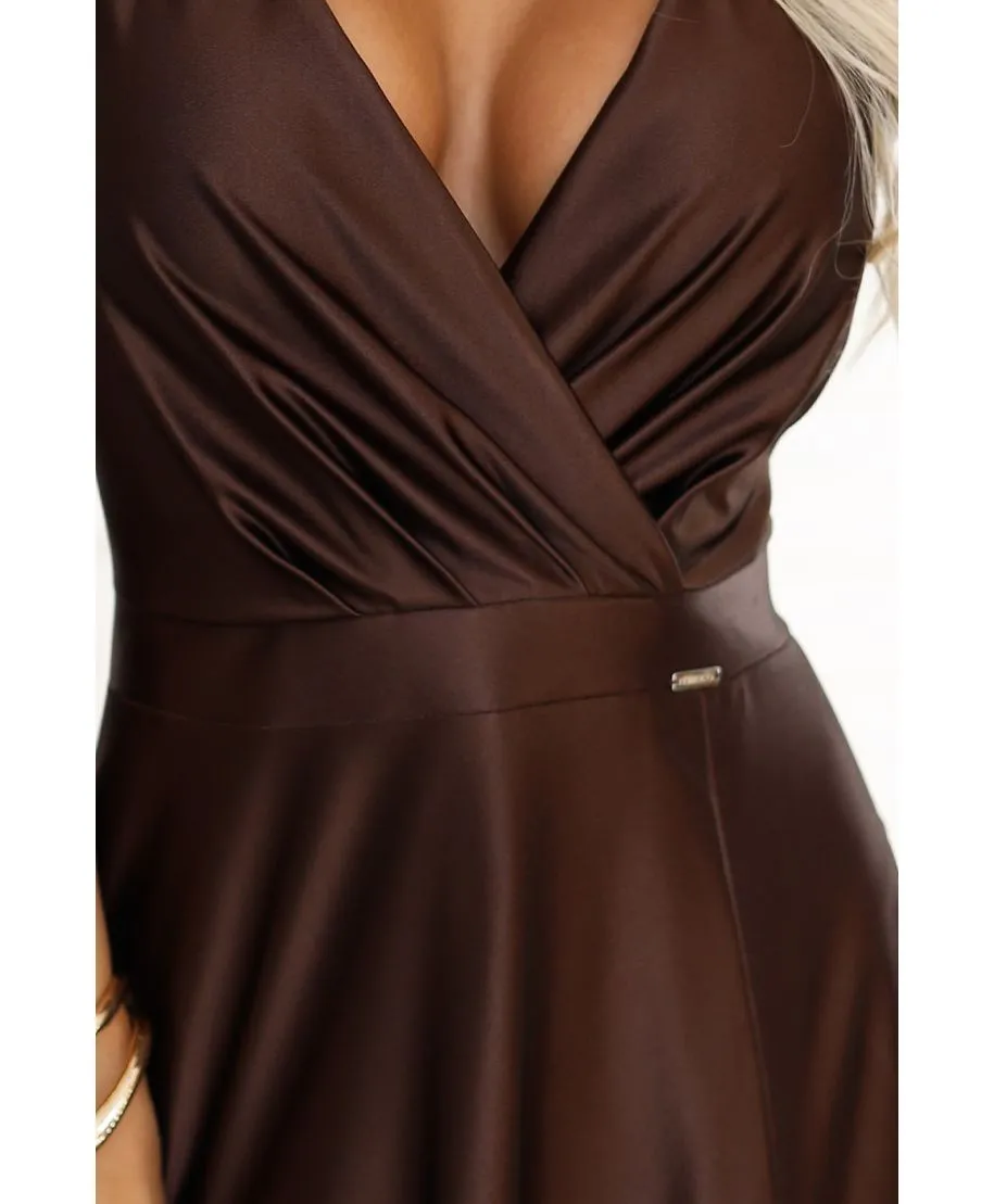 Abito lungo in raso con scollo a portafoglio e maniche ad aletta – marrone cioccolato