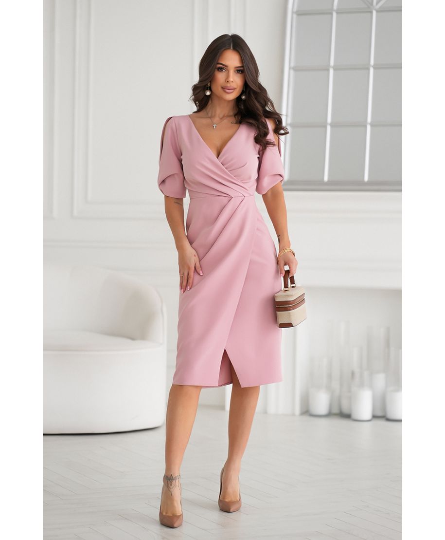 Distinguiti con questo abito midi rosa sporco, un capo sofisticato e di tendenza. Perfetto per cerimonie, eventi eleganti o serate speciali. Il design avvolgente con scollatura a V profonda esalta il décolleté, donando un tocco sensuale e raffinato. Le maniche con spacco aggiungono movimento e originalità, mentre il taglio a portafoglio con drappeggio valorizza la silhouette, creando un effetto slanciato e armonioso. Il tessuto leggero e fluido garantisce un comfort ottimale, accompagnando dolcemente ogni movimento.