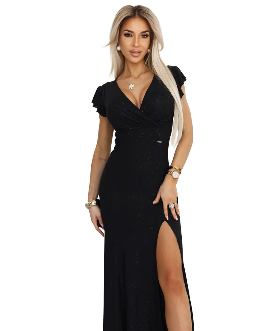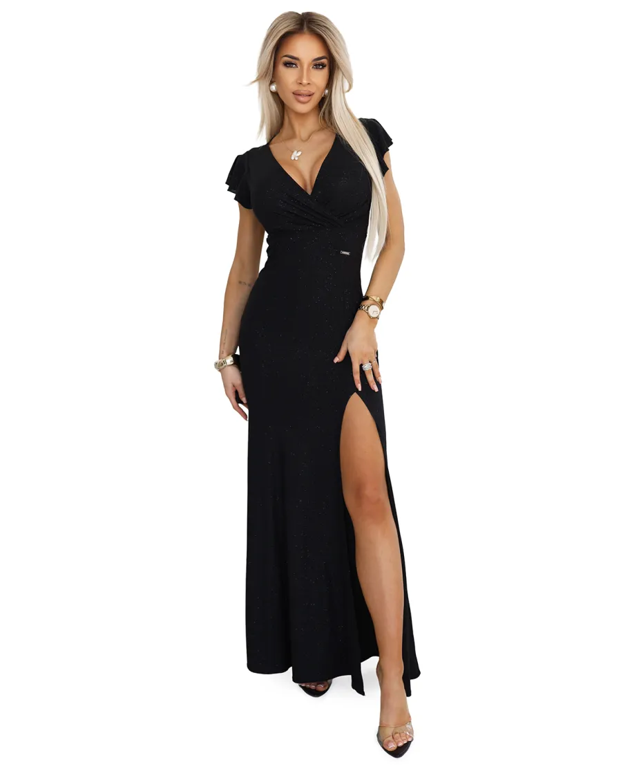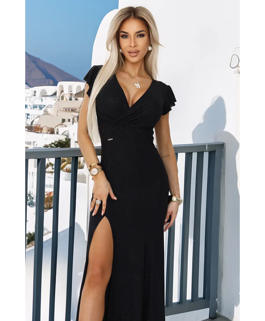 • Elegante abito nero lungo con spacco per serate indimenticabili.