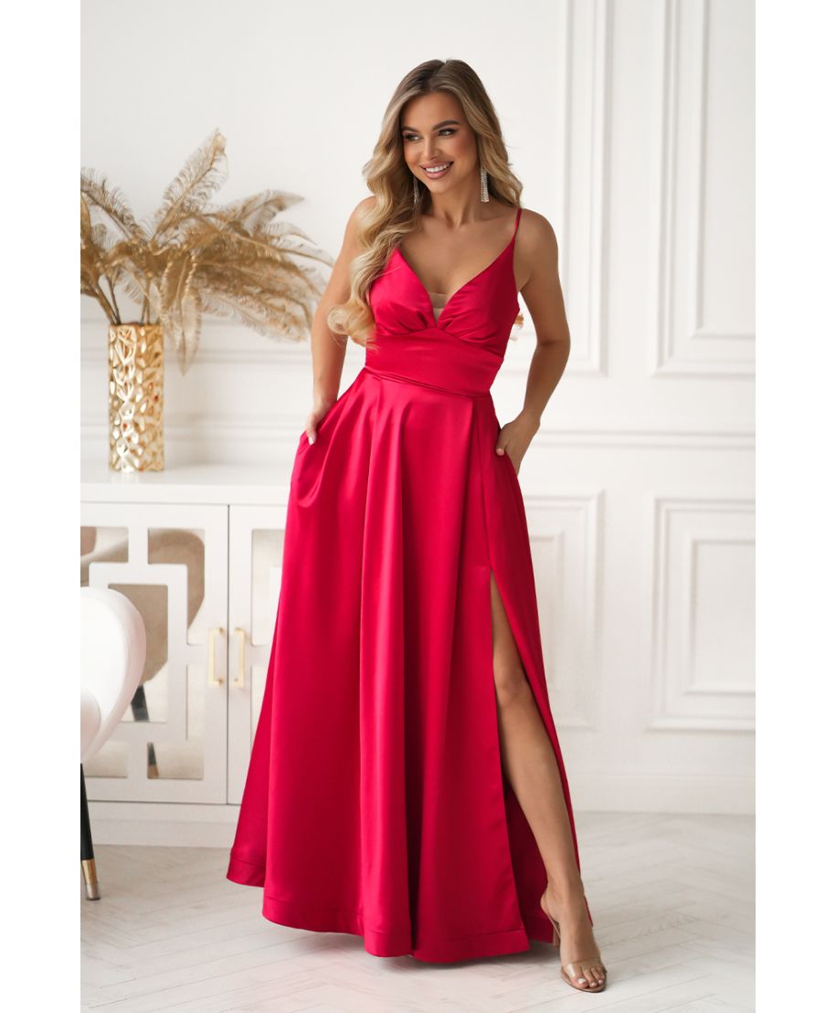 Vestito Lungo da Sera Rosso in Satin Lucente con Spacco – Fascino Senza Tempo