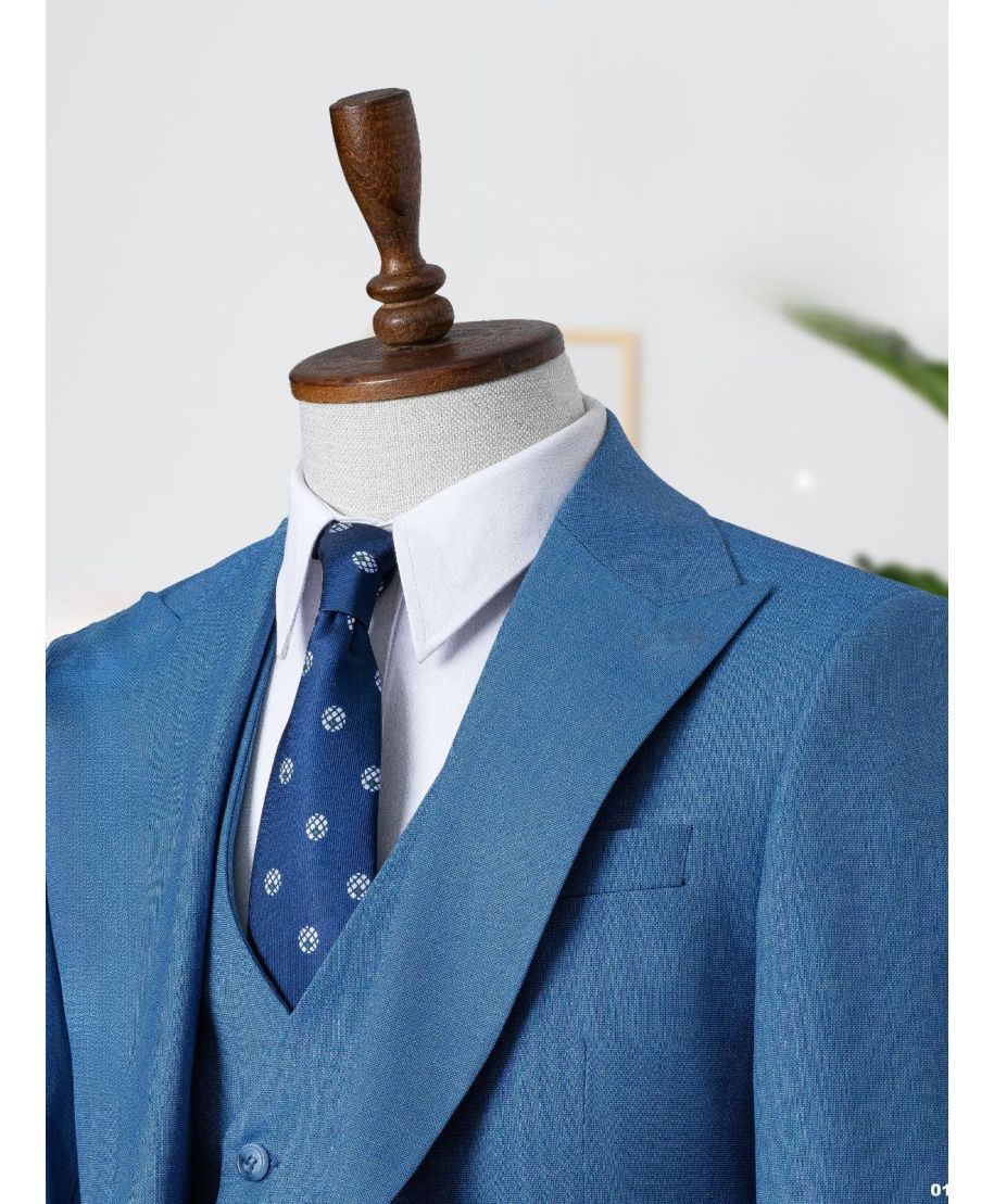 Realizzato con un occhio attento ai dettagli e al comfort, l'abito è prodotto con tessuti di primissima scelta. È composto per il 50% da wiskoza, un materiale noto per la sua morbidezza e brillantezza simil-seta, garantendo un aspetto raffinato e un comfort duraturo. Il 45% di poliestere permette una maggiore resistenza e longevità del capo, mentre il 5% di elastan aggiunge quel tocco di elasticità che assicura una perfetta vestibilità. Ogni dettaglio è curato, dall'elegante gilet doppiopetto alla tonalità azzurra dell'abito, che cattura lo sguardo senza risultare eccessivo.