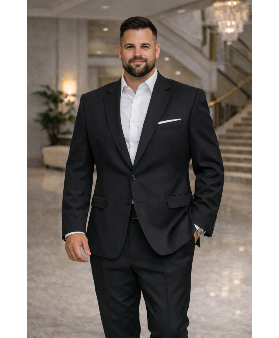 Per un look impeccabile, abbina l'abito nero Modello Colosseum con una camicia bianca classica e una cravatta in seta dai toni neutri, come grigio perla o blu notte. Completa l'outfit con un paio di scarpe in pelle lucida nere e una cintura abbinata. Se desideri un tocco di colore, opta per un fazzoletto da taschino dai colori vivaci o una spilla da giacca elegante.