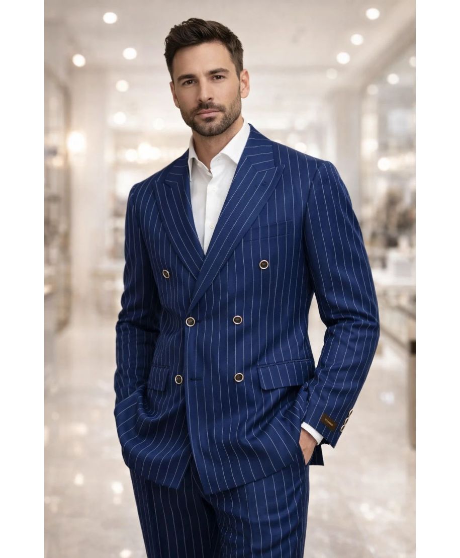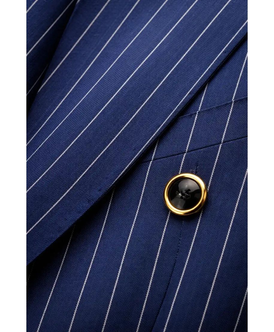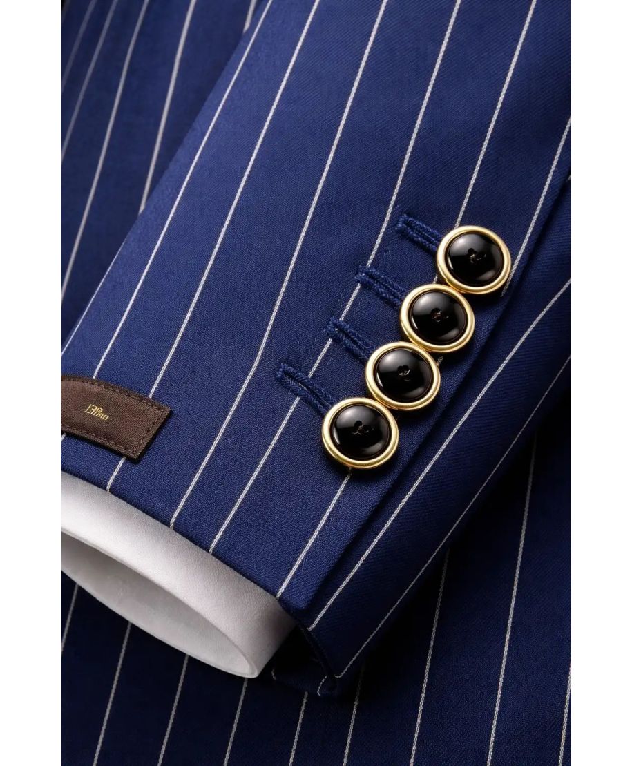 Eleganza per ogni cerimonia : Il gessato nero elevato dalla raffinatezza del doppiopetto.
