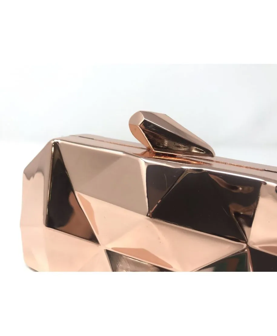 Questo accessorio donna è in materiale rigido molto moderna e modaiola, simil oro lucido. La chiusura gioiello riprodotta serve a nascondere il clip della nostra pochette donna elegante oro.