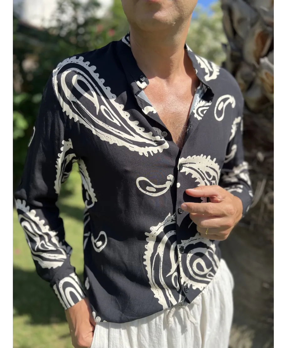 Camicia coreana nera con disegno cachemire – Manica lunga, estiva