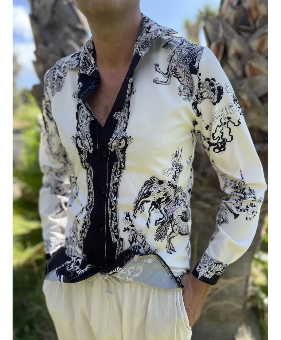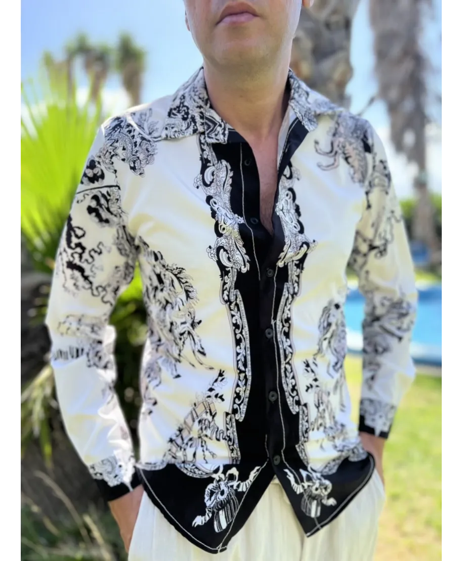Camicia da uomo a manica lunga con un design d’impatto che unisce eleganza classica e stile contemporaneo. La stampa a contrasto blu su fondo bianco crea un effetto visivo sofisticato e ricercato, perfetto per l’uomo che desidera distinguersi con classe. Realizzata con tessuti leggeri e traspiranti, è ideale per ogni stagione e per occasioni formali o outfit di tendenza dal carattere deciso.