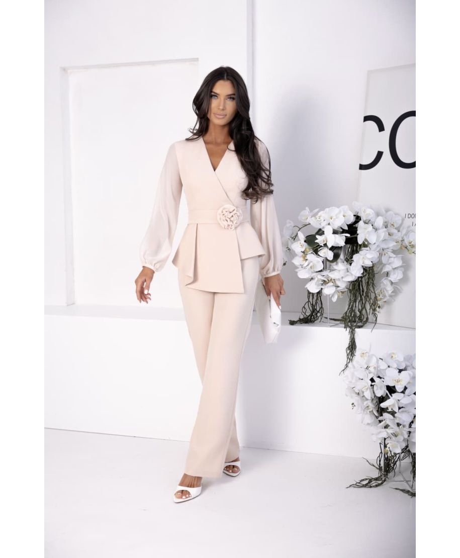 Pantaloni a palazzo e top con cinturino in vita decorato da una rosa
