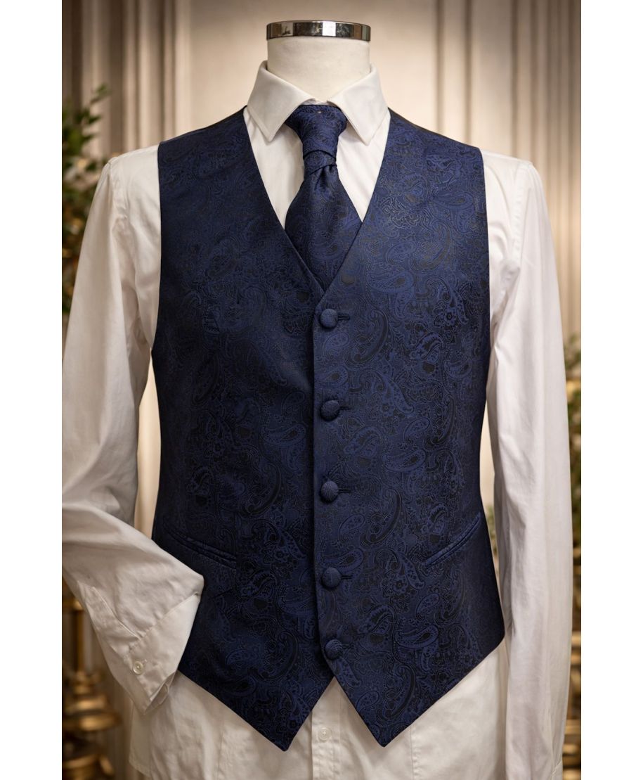 - Elegante gilet blu damascato abbinato alla cravatta da cerimonia : perfetto per cerimonie formali.