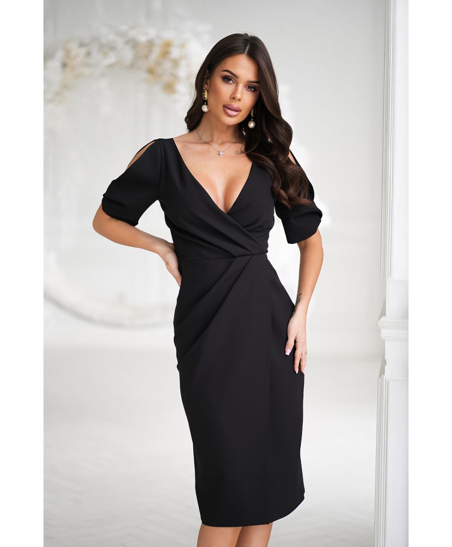 Distinguiti con questo abito midi nero, un capo sofisticato e di tendenza. Perfetto per cerimonie, eventi eleganti o serate speciali. Il design avvolgente con scollatura a V profonda esalta il décolleté, donando un tocco sensuale e raffinato. Le maniche con spacco aggiungono movimento e originalità, mentre il taglio a portafoglio con drappeggio valorizza la silhouette, creando un effetto slanciato e armonioso. Il tessuto leggero e fluido garantisce un comfort ottimale, accompagnando dolcemente ogni movimento.