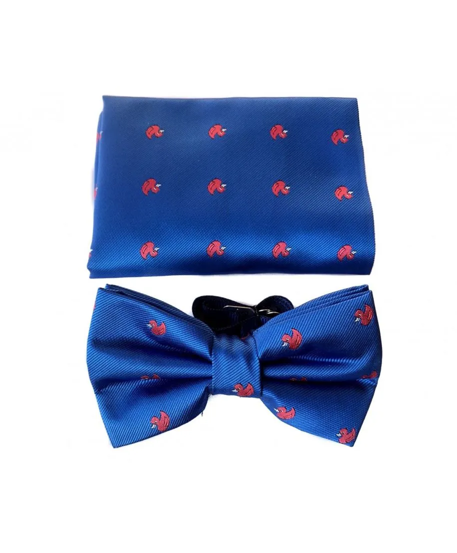 Papillon uomo blu con delle paperelle rosse ricamate. Lo vendiamo abbinato alla pochette.