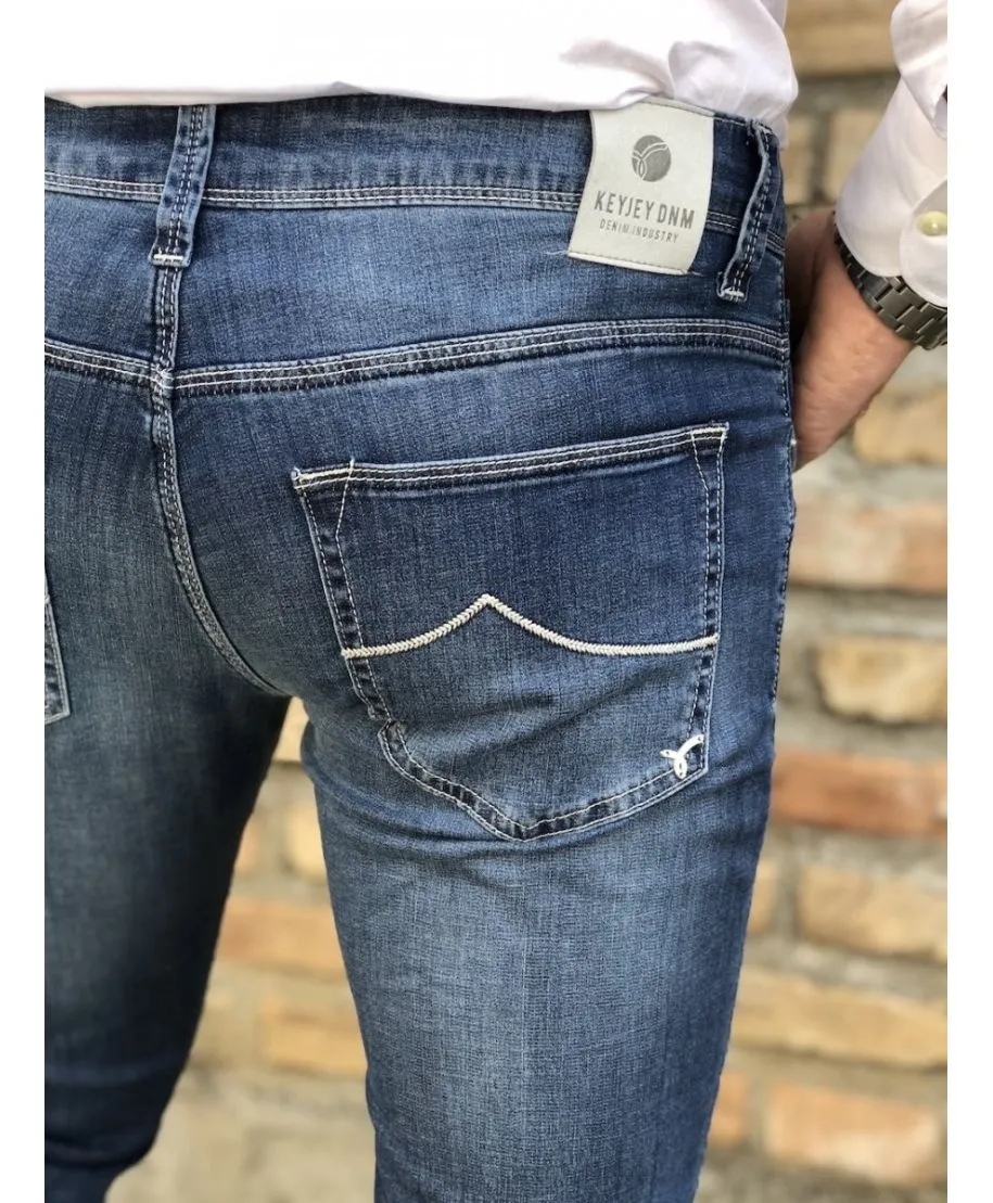 Jeans uomo del brand Key Jey è un classico che non può mancare nel guardaroba maschile. Tessuto leggero perfetto anche per le calde giornate estive. Tasca america davanti e classica dietro. Jeans uomo Key Jey dal lavaggio medio leggermente più chiaro sulle cosce e ginocchia.  Questo è un jeans perfetto per essere indossato con le giacche, camicie, polo ma va benissimo anche con le t-shirt.