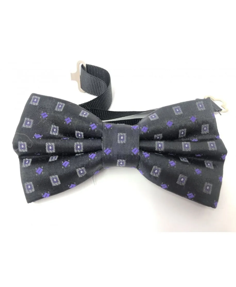 Papillon uomo base nera in tessuto lucido e quadrato viola ricamato come disegno.