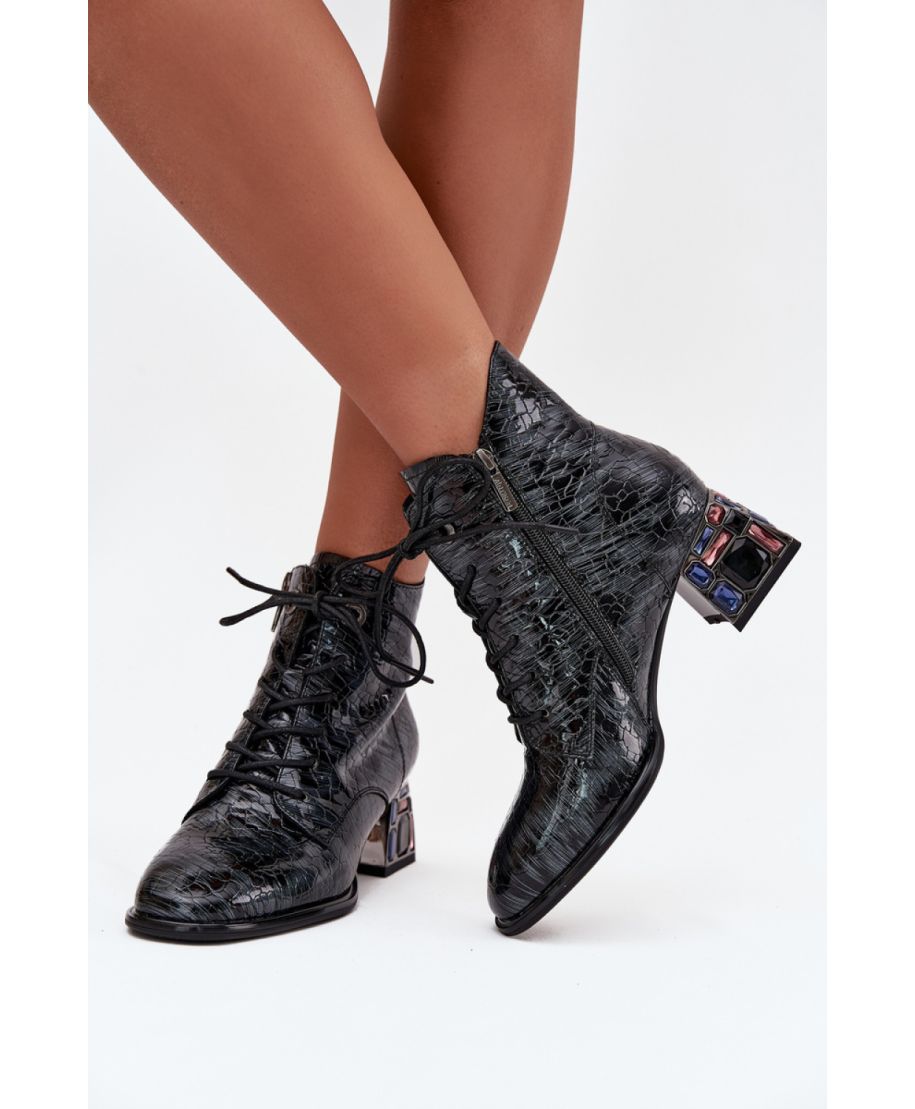 Stivali da donna della marca Artiker realizzati in pelle lucida naturale sono scarpe eleganti con un tocco di originalità. Montati su un solido tacco a blocco, decorato con cristalli, attirano l'attenzione e aggiungono un carattere unico agli outfit. Il modello combina lacci con una pratica chiusura lampo, che facilita la calzata e l'adattamento al piede. Le punte arrotondate sottolineano il taglio classico, mentre l'interno foderato con morbida pelliccia sintetica garantisce comfort e calore nei giorni più freddi.
