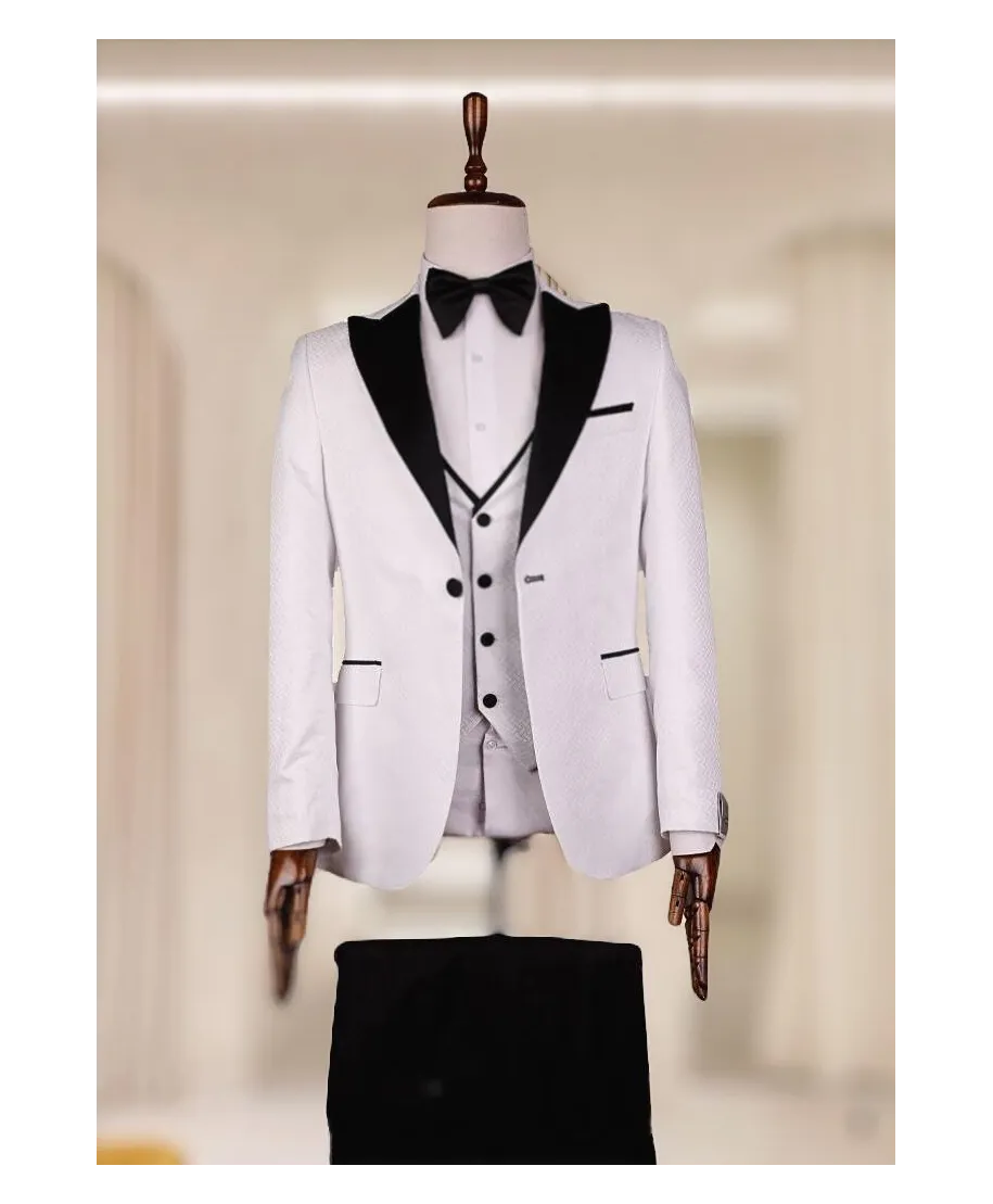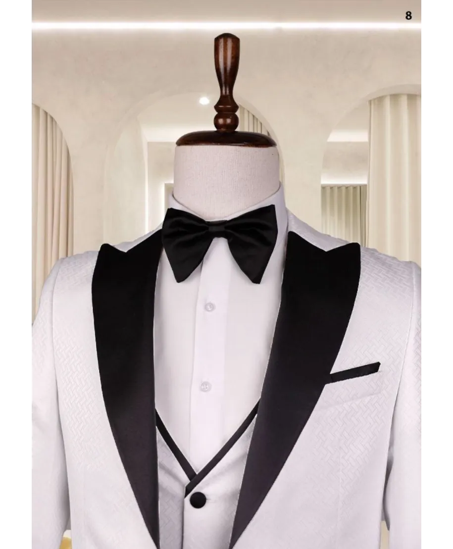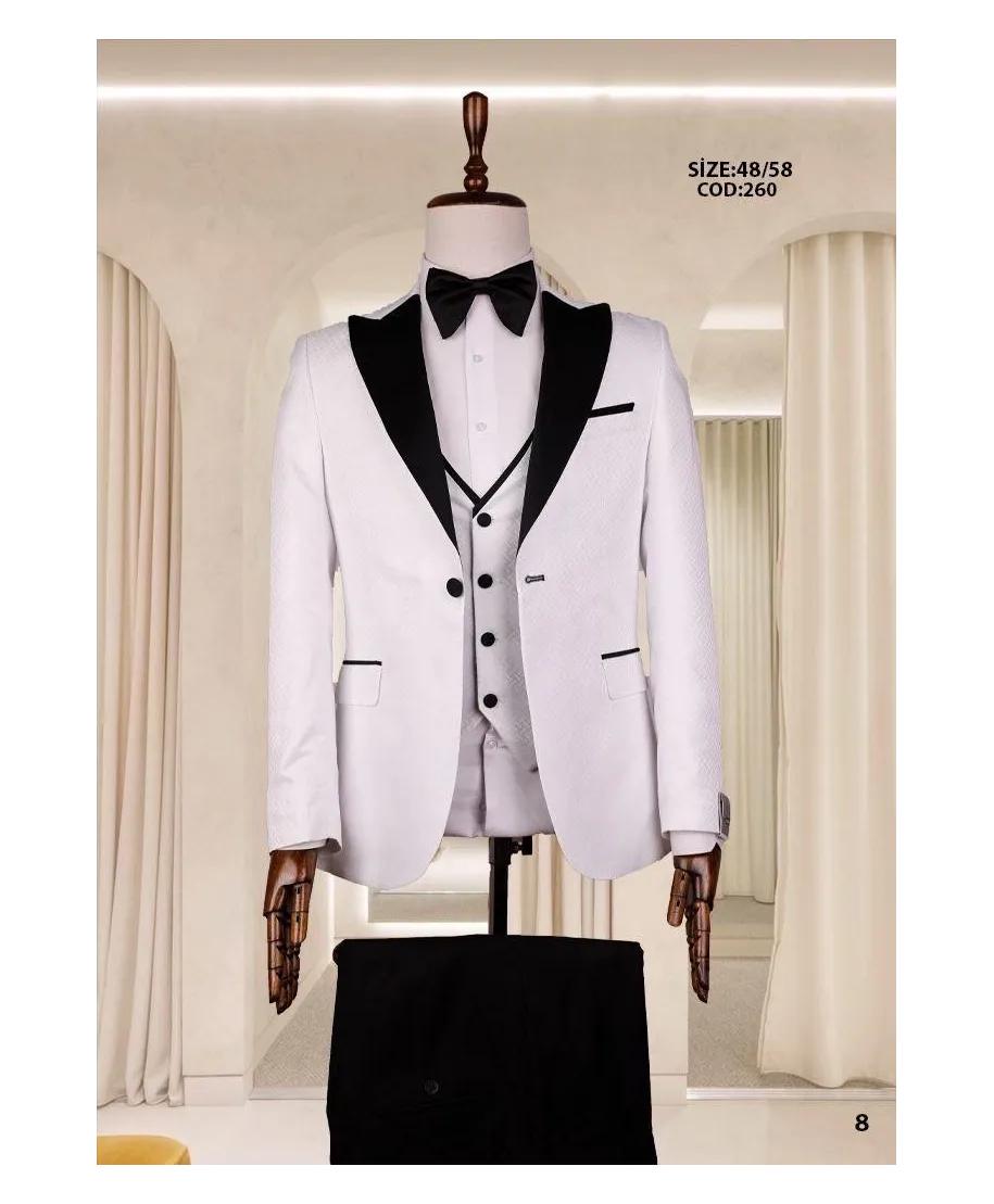 Un completo raffinato e scenografico pensato per le occasioni più esclusive. Il modello 260 si distingue per il contrasto netto tra il bianco luminoso della giacca e il nero satinato dei dettagli, dando vita a un look d’impatto, sofisticato e memorabile.