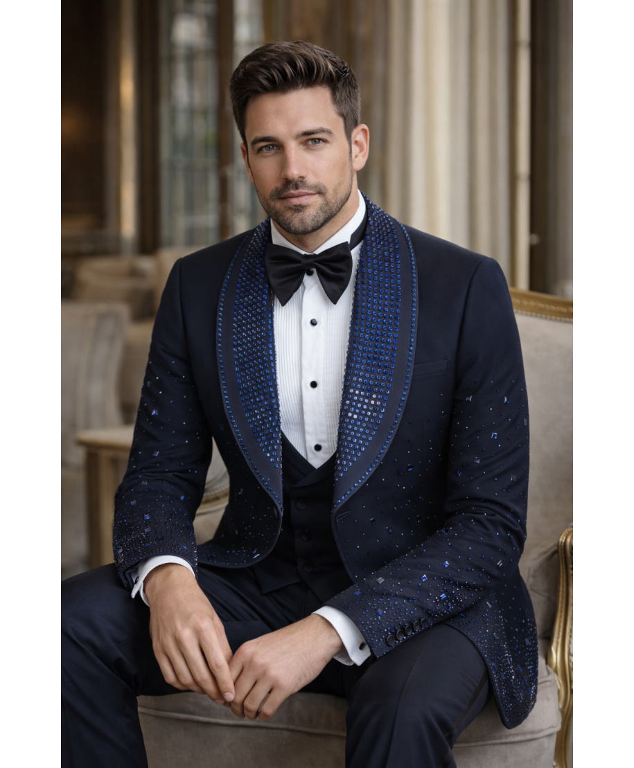Smoking sposo blu con strass sulla giacca, un capo estremamente di tendenza