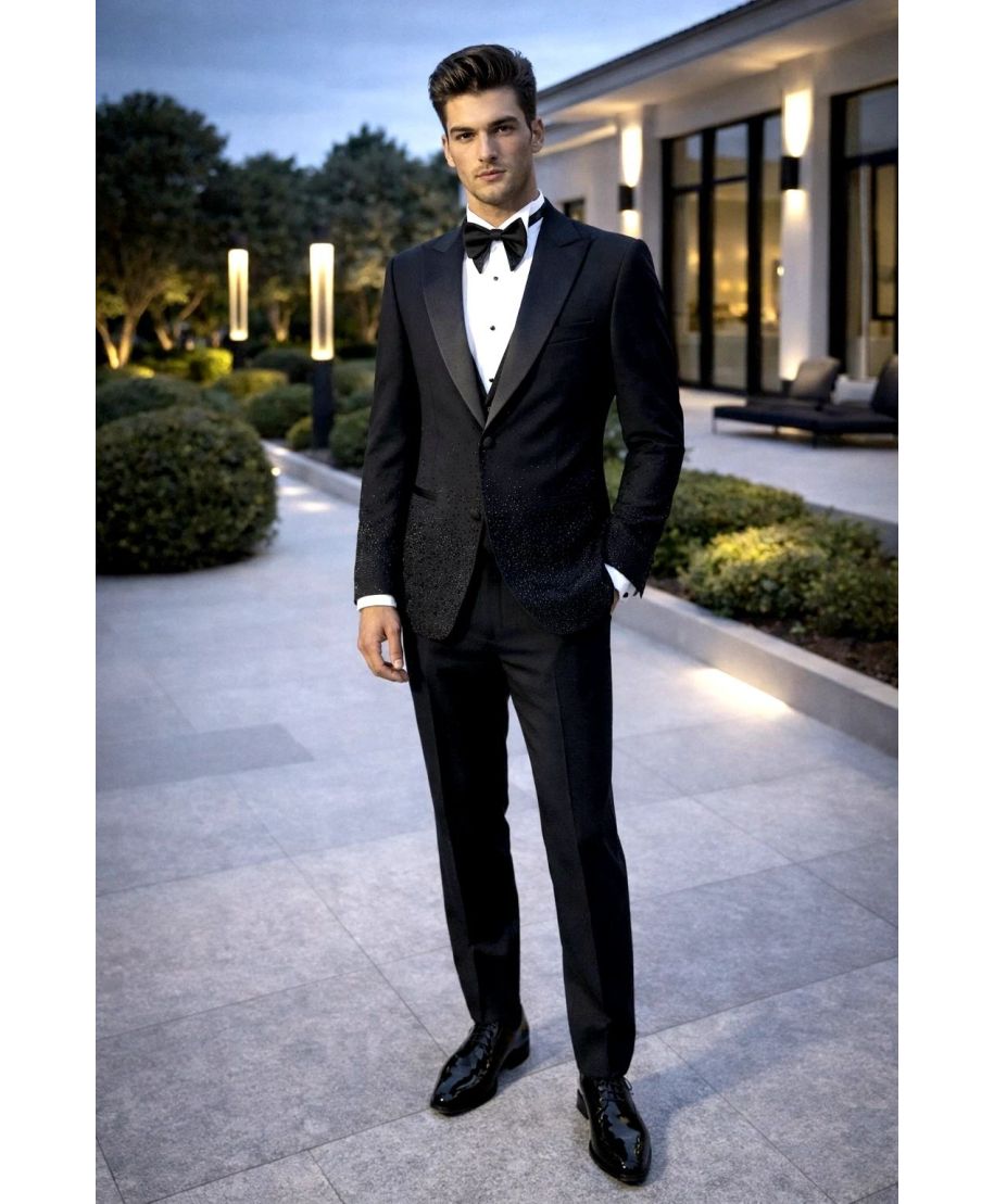 Scopri la straordinaria eleganza dello Smoking uomo Brillantinato nero - Modello Los Angeles, un capo esclusivo nella categoria Smoking uomo, creato per coloro che desiderano distinguersi con stile inconfondibile. Questo pregiato smoking, prodotto con maestria al di fuori dell'Unione Europea, è un tributo alla sartoria d'eccellenza grazie ai suoi materiali e alle sue finiture impeccabili. La sua straordinaria lucentezza è ottenuta attraverso un complesso trattamento brillantinato che regala un effetto visivo unico, capace di catturare l'attenzione in qualsiasi situazione.