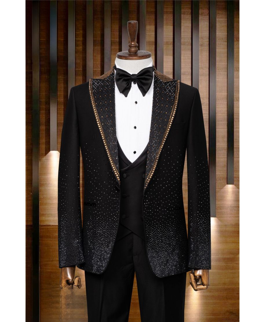 Realizzato con un tessuto nero di alta qualità, questo smoking si caratterizza per gli strass oro che adornano il tessuto con dettagli sontuosi e sofisticati, perfetti per riflettere una personalità forte e audace. L'attenzione alla qualità è evidente in ogni cucitura e dettaglio, rendendolo un pezzo versatile ma allo stesso tempo straordinario.